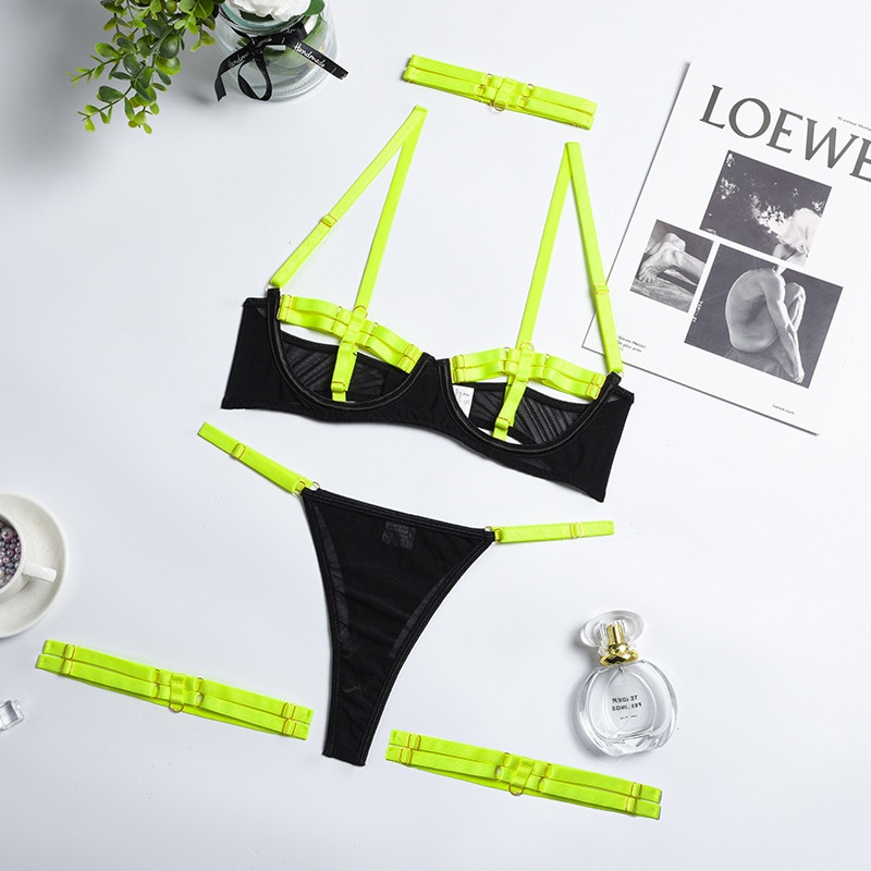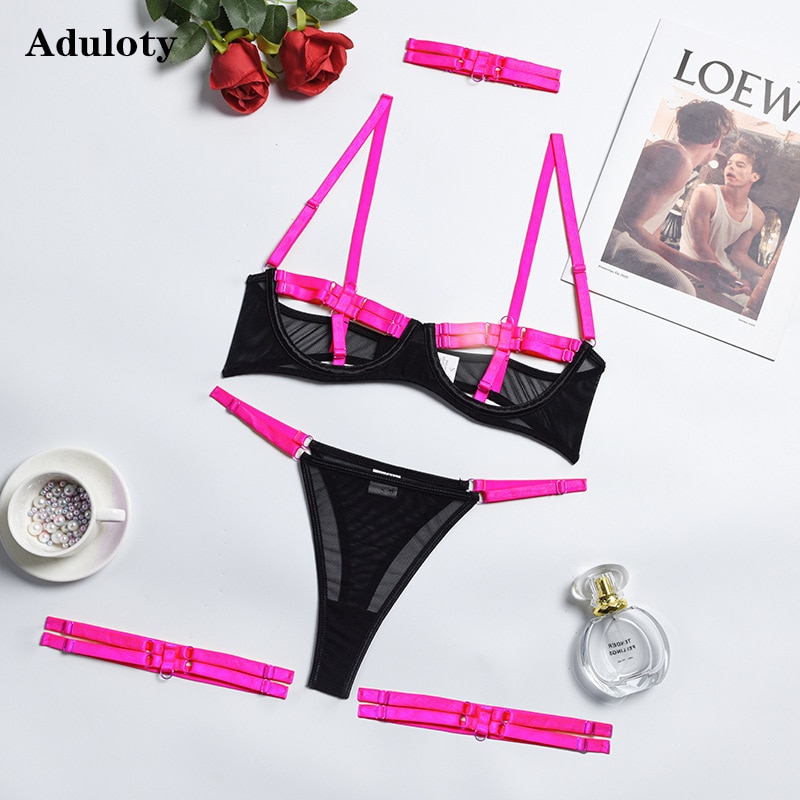 Billionm Billionm Women's Bra Set Summer New Lace Mesh Thin Sexy Lingerie Neck Ring Leg Ring Fashion Temptation Erotic Underwear Set 1215-0