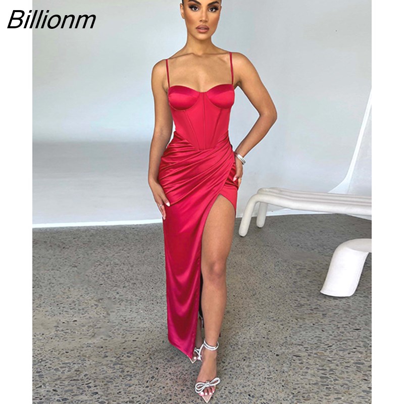 Billionm Elegant Satin Spaghetti Strap High Split Midi Dress For Women Robe 2022 New Backless Ruched Party Long Dresses Vestido