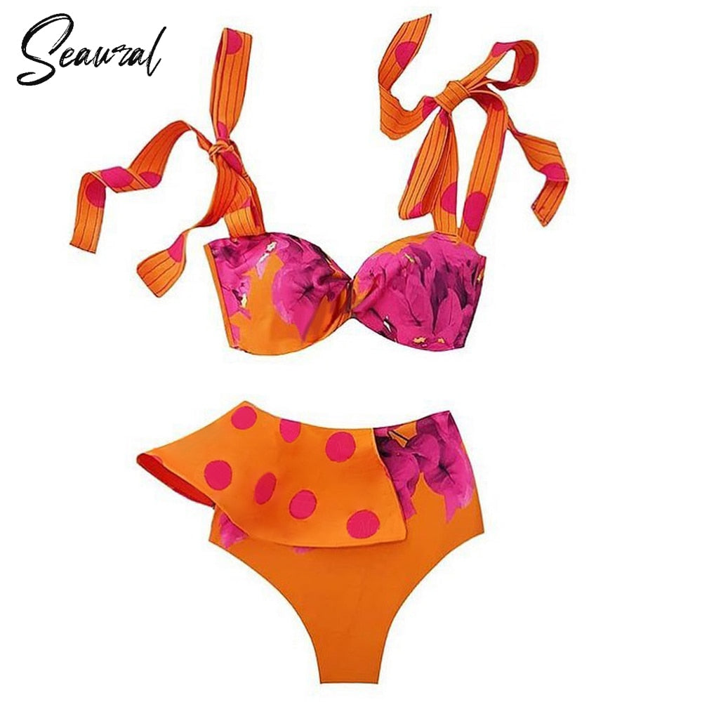 2021 New Sexy Bikini Set High Waist Print Dots Floral Swimsuit Strappy Swimwear Women Bathing Suit Summer Beach Wear biquini