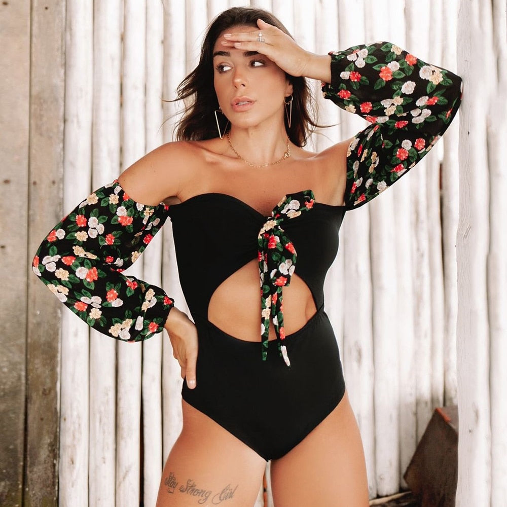 2022 New One Piece Swimsuit Print Retro Long Sleeve Swimwear Women Bandage Floral Bathing Suits Strappy Backless Beach Wear