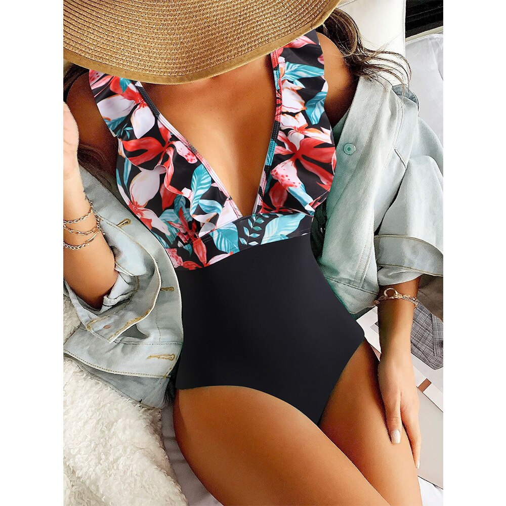 2022 New Sexy Ruffle One Piece Swimsuit Off The Shoulder Print Floral Swimwear Women Solid Deep-V Bathing Suits Summer Beachwear