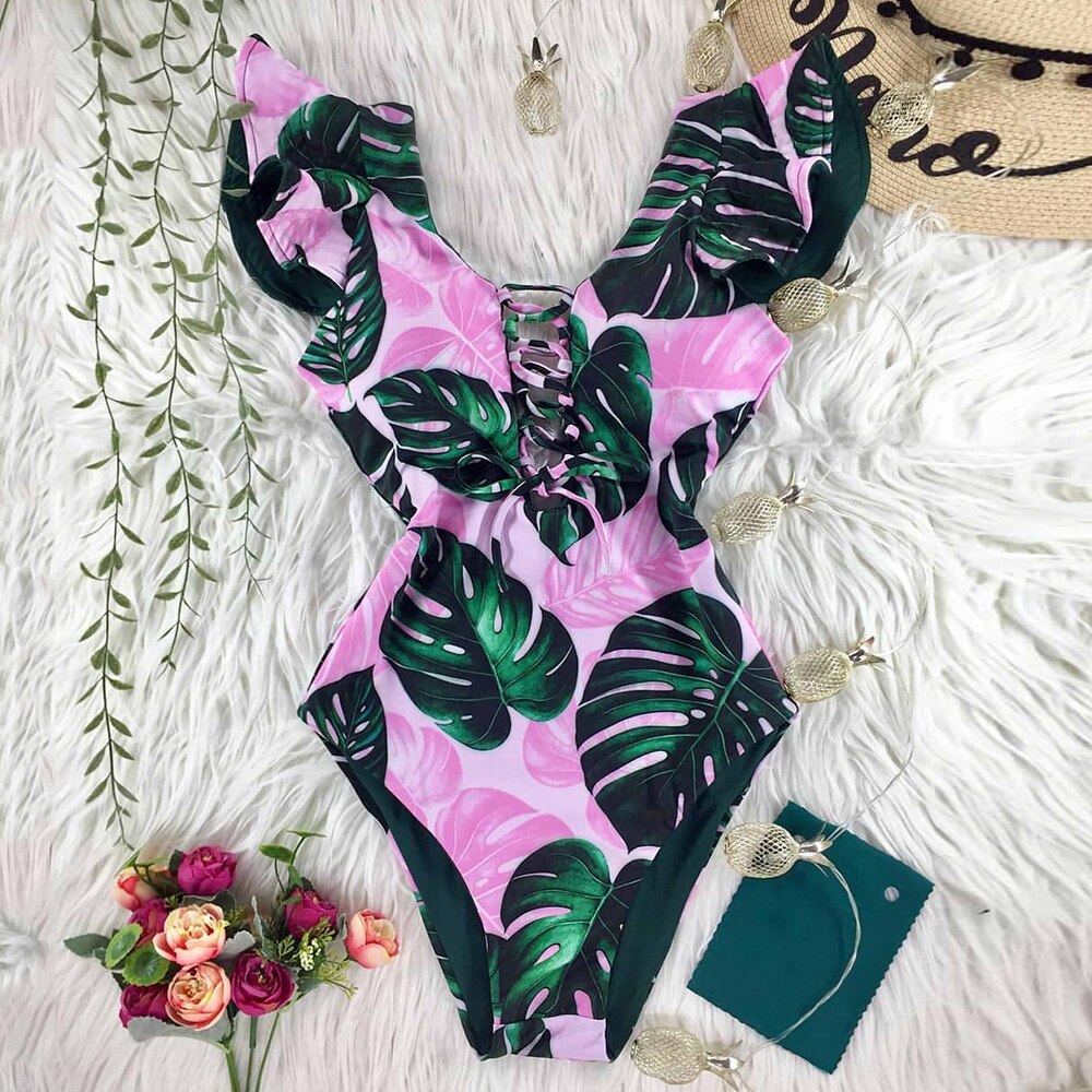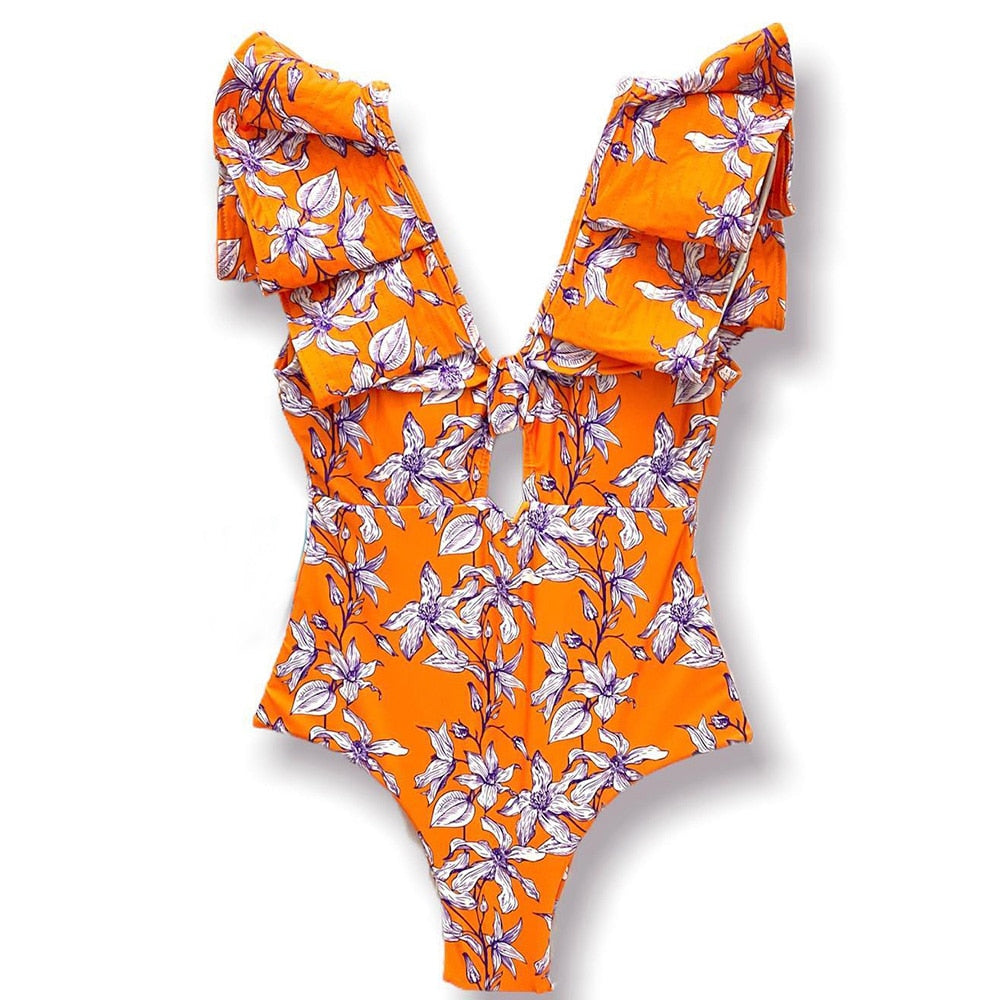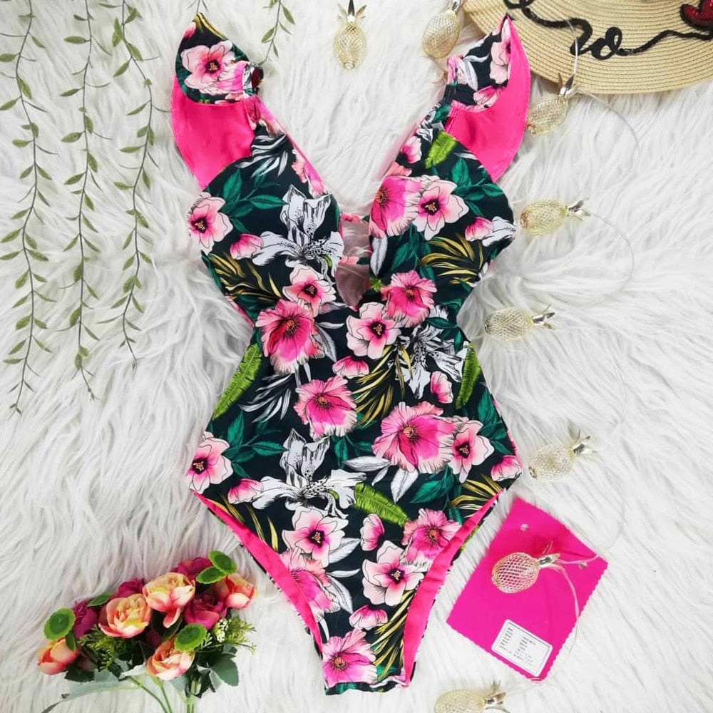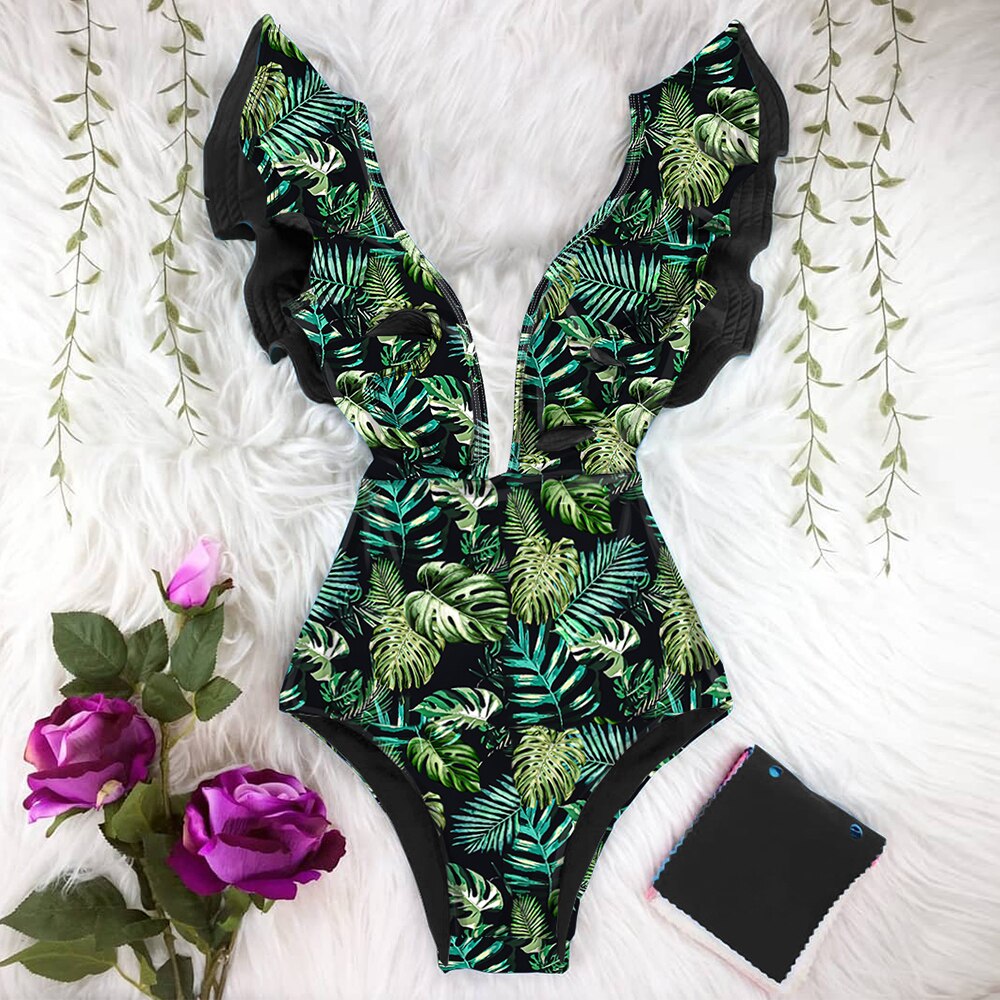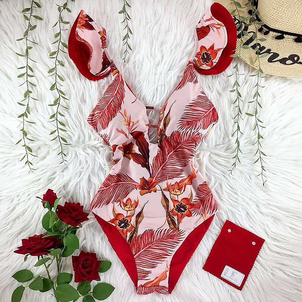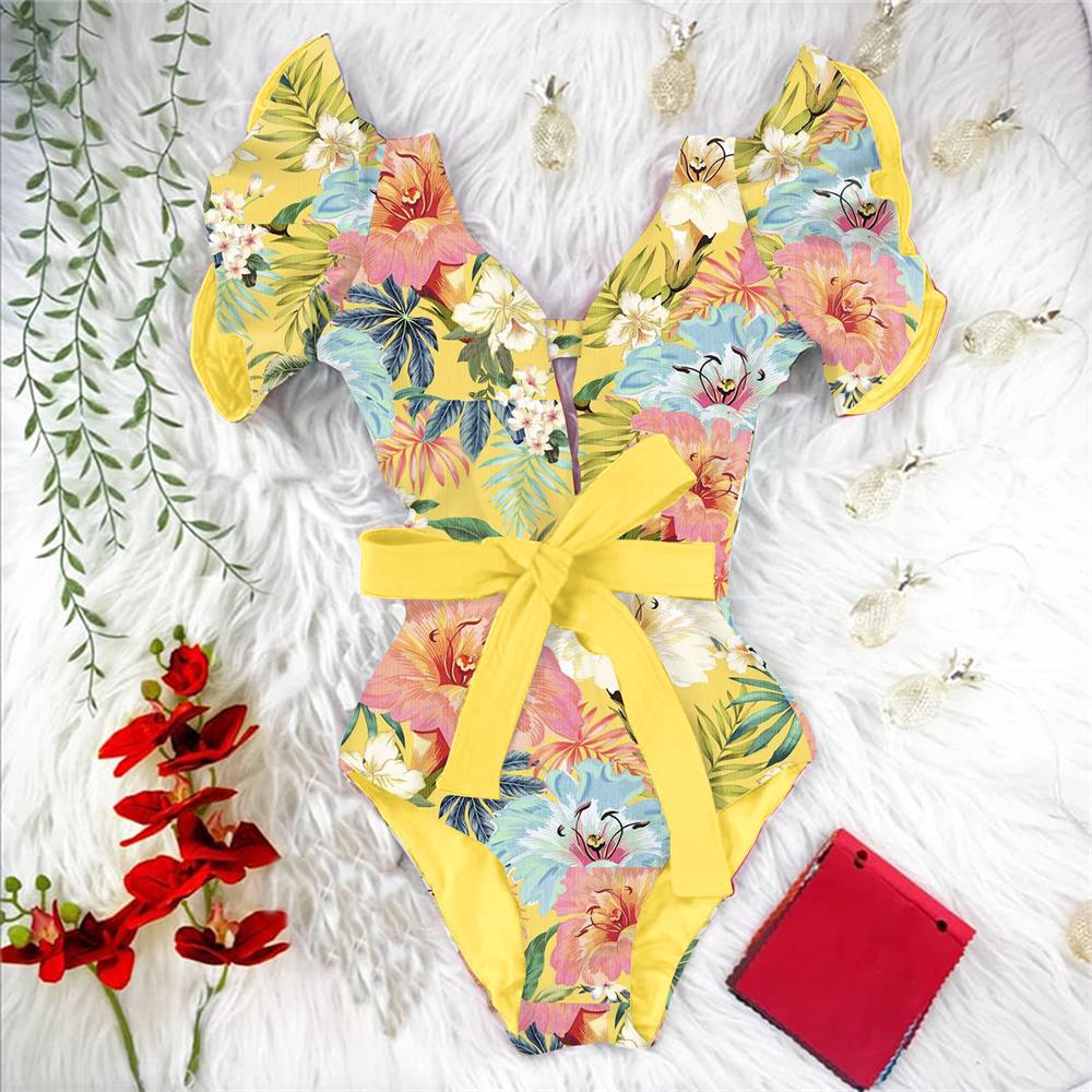 2022 New Sexy Ruffle Print Floral One Piece Strappy Slimming Swimwear Women Swimsuit Deep-V Bathing Suit Beach Wear Monkini