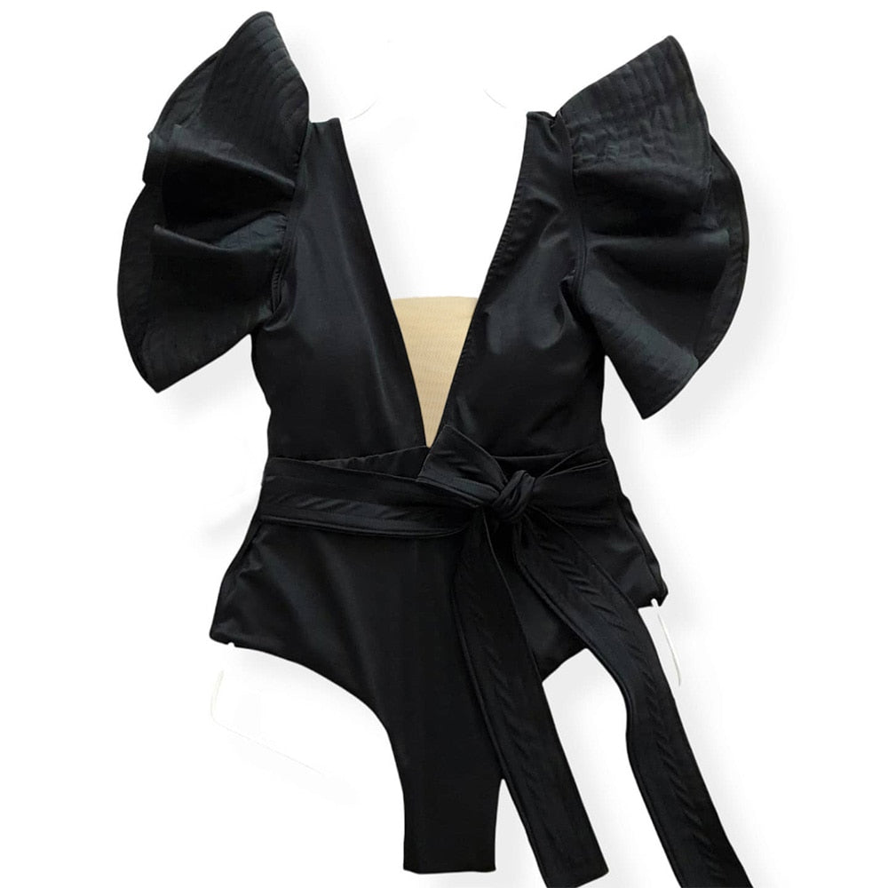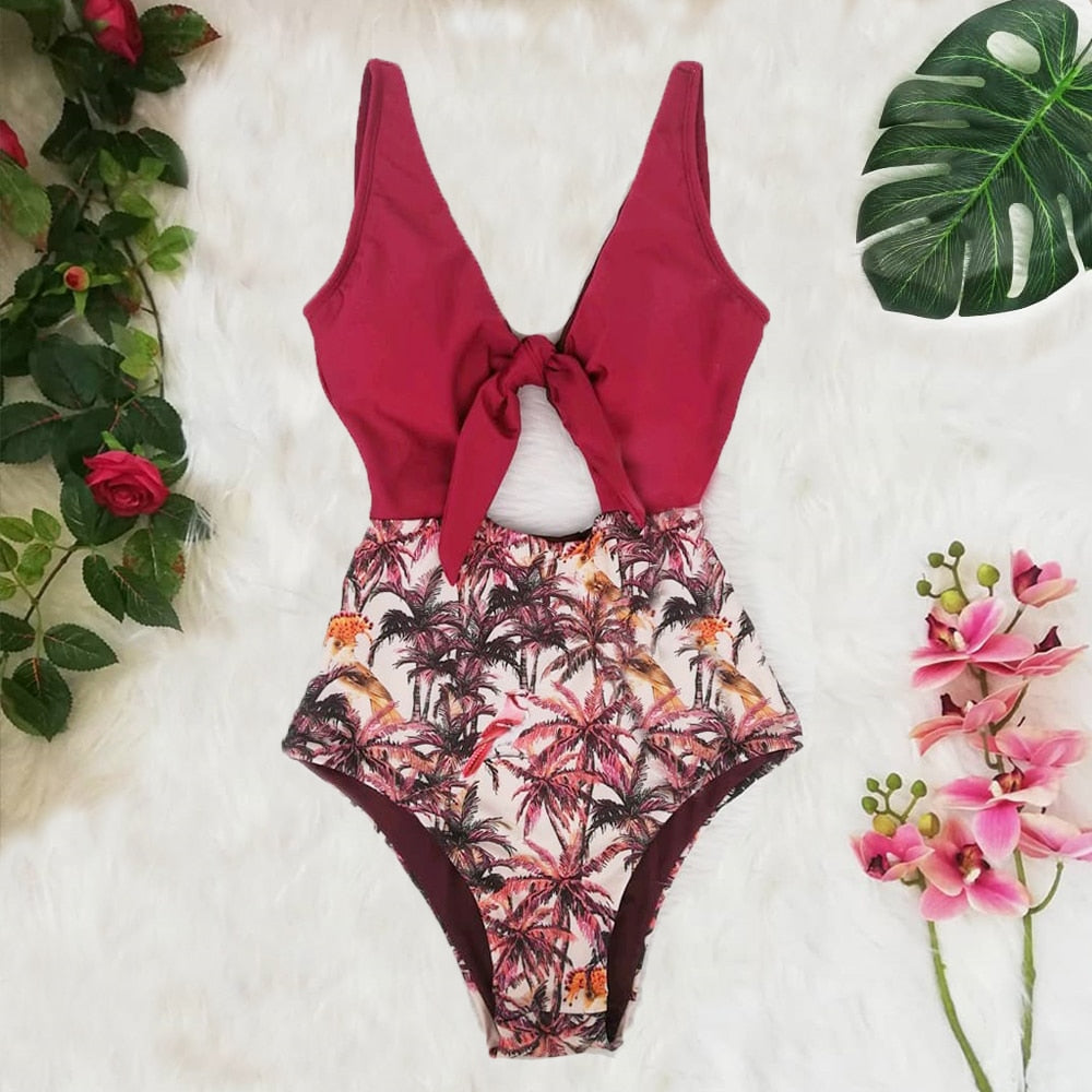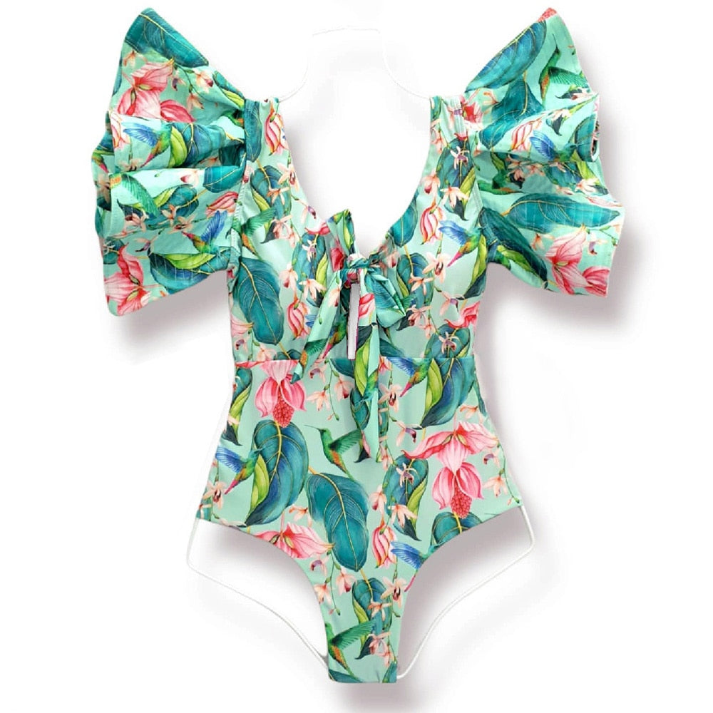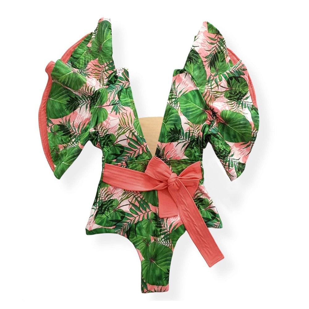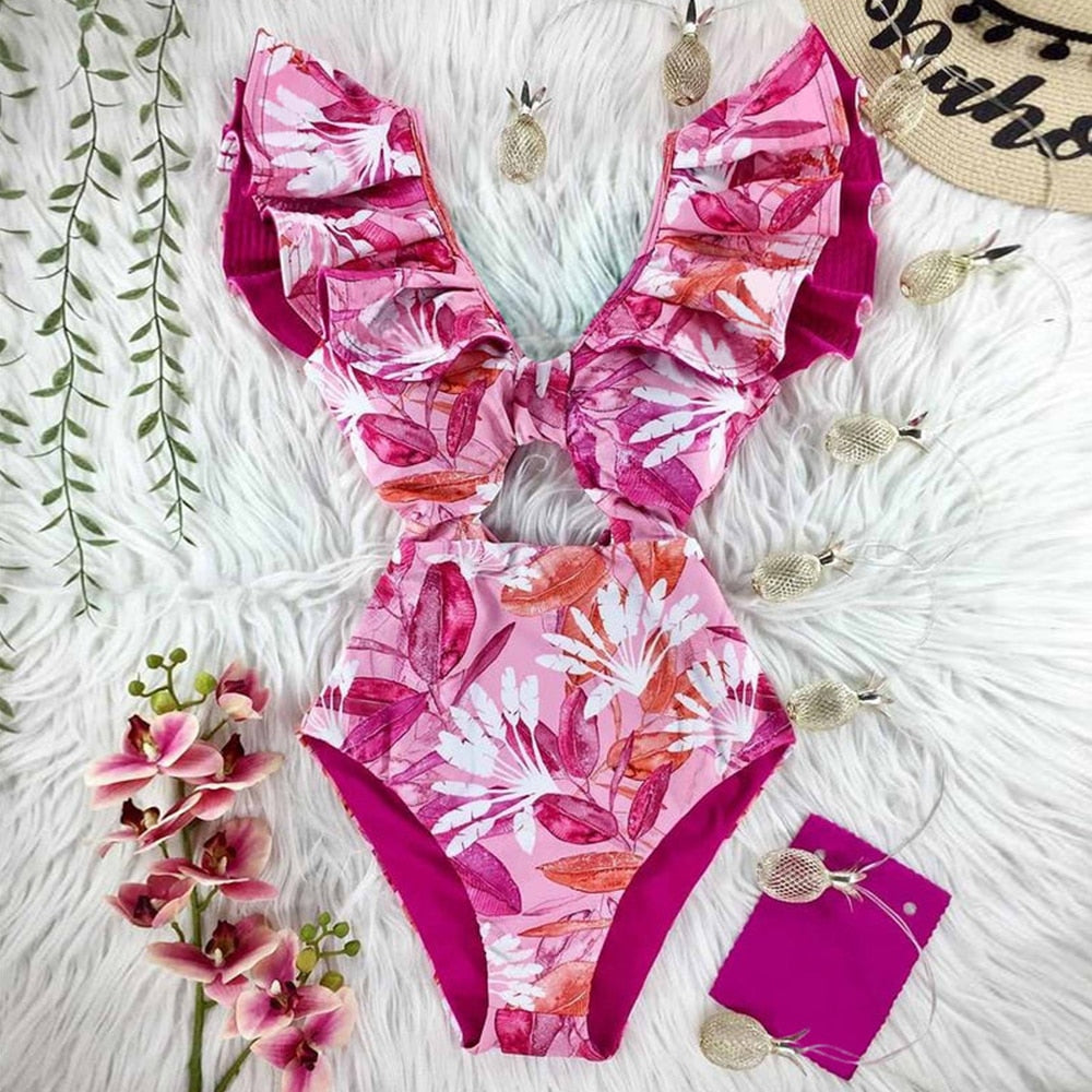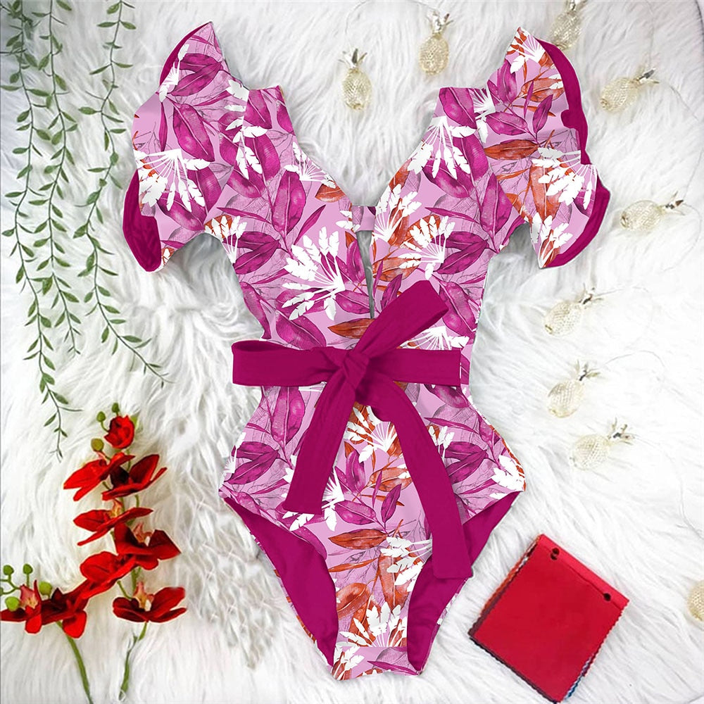 2022 New Sexy Ruffle Print Floral One Piece Strappy Slimming Swimwear Women Swimsuit Deep-V Bathing Suit Beach Wear Monkini