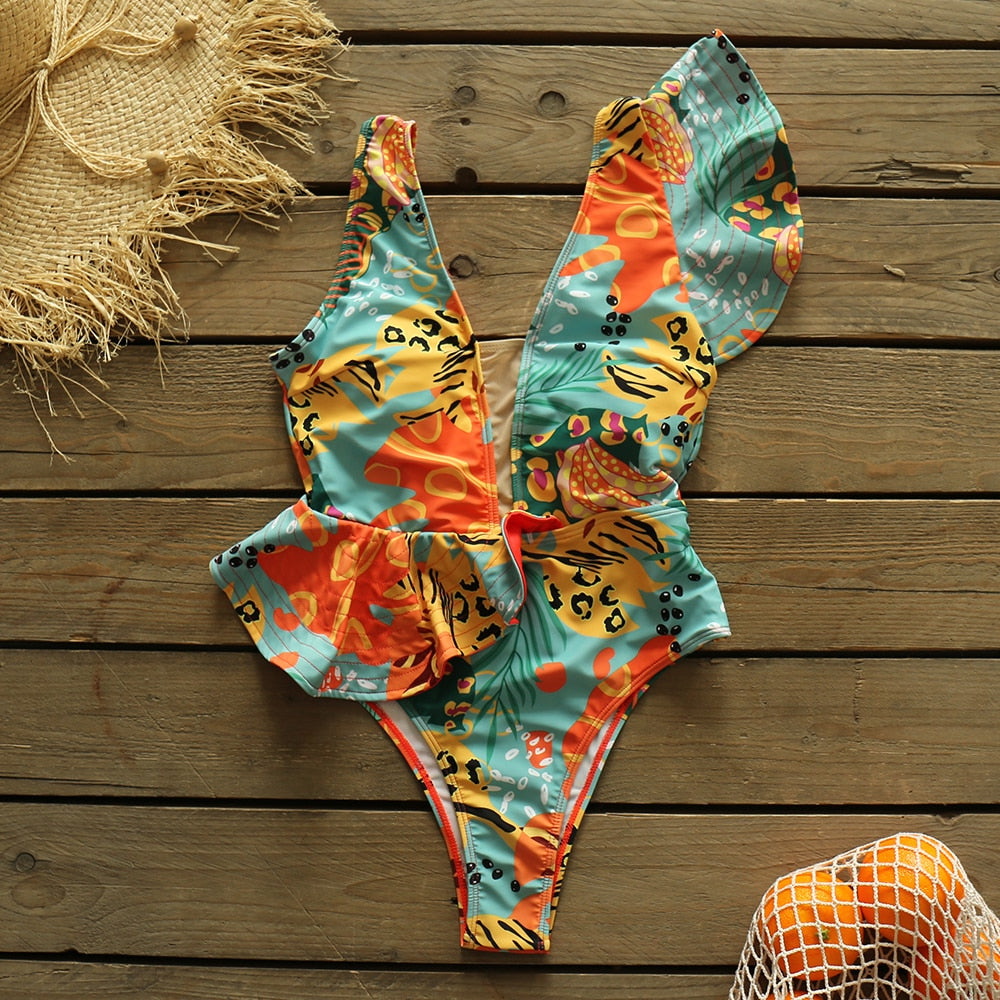 2022 New Sexy Ruffle Print Floral One Piece Swimsuit Swimwear Women Solid Deep-V Beach Wear Bathing Suit Summer Monkini