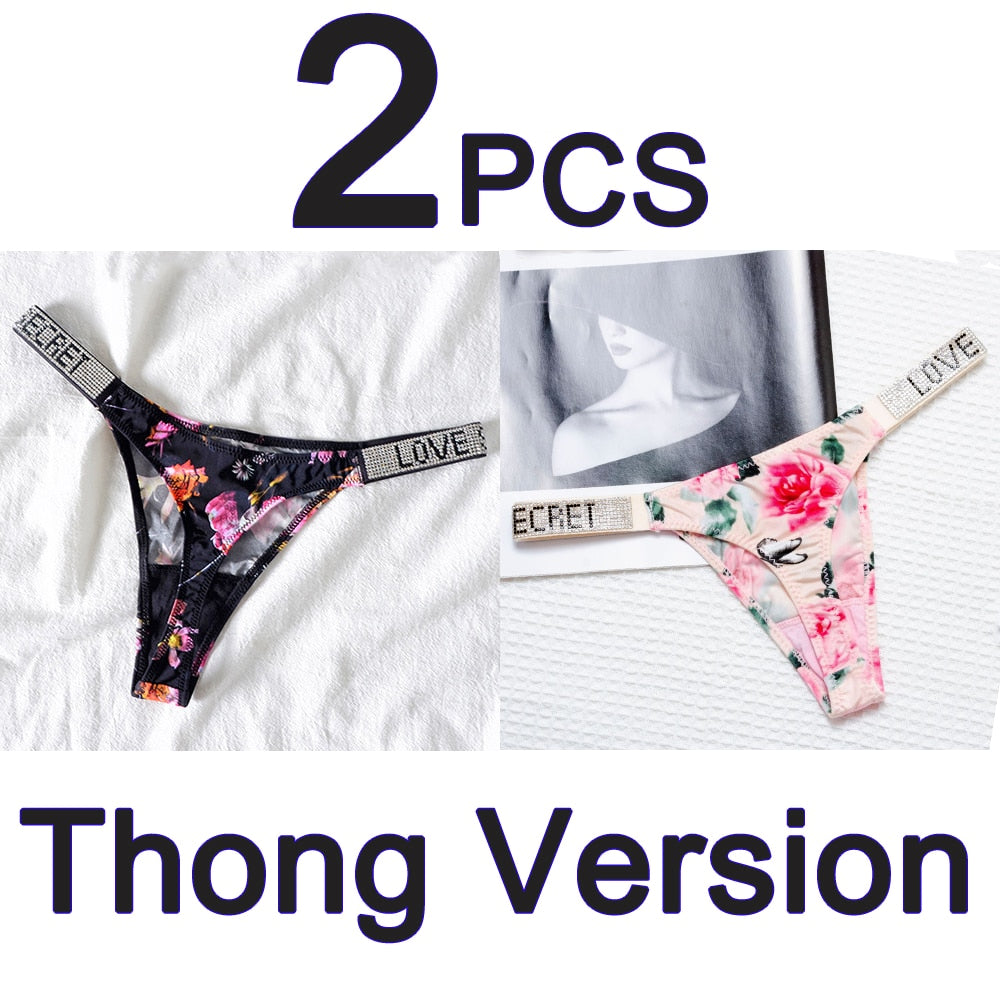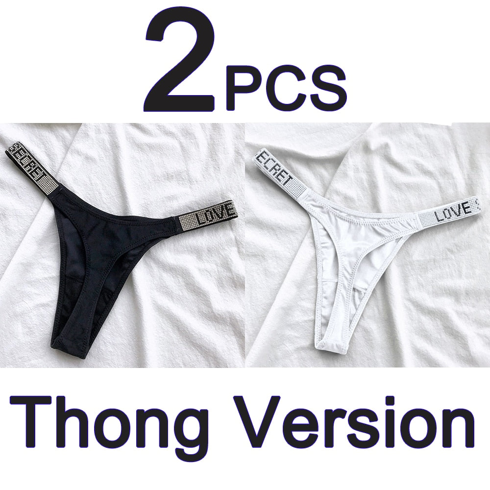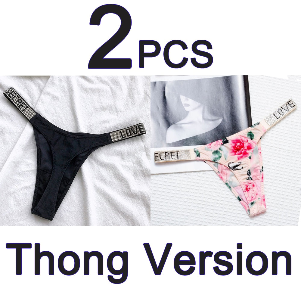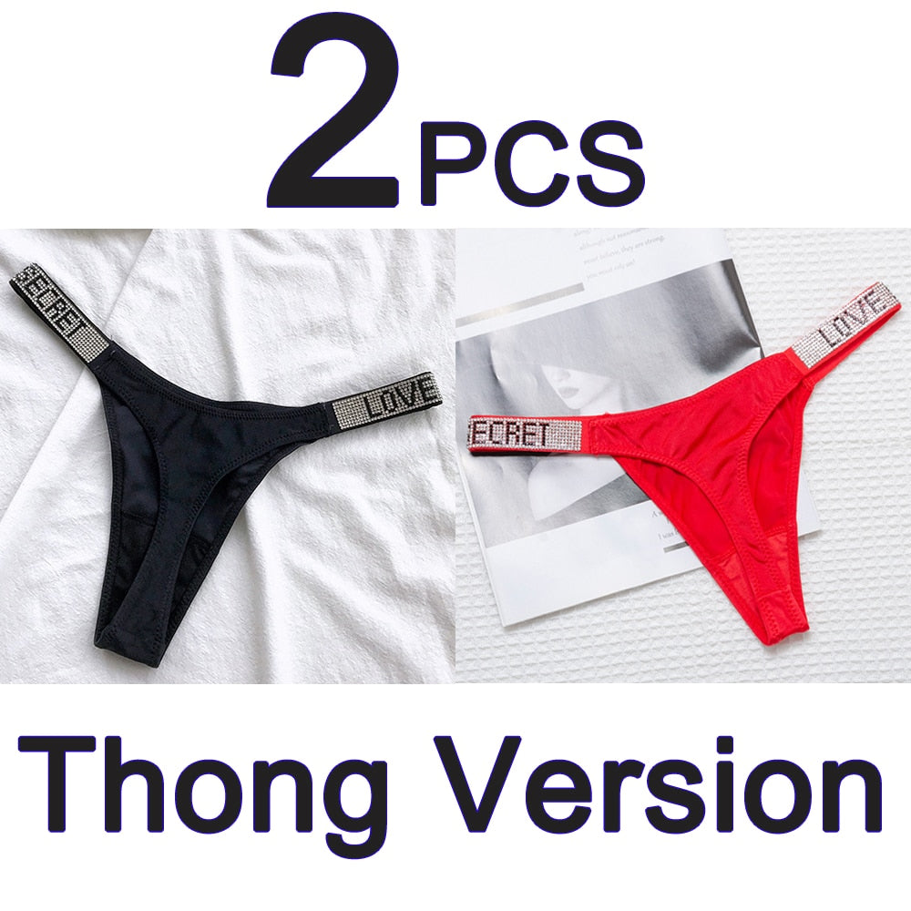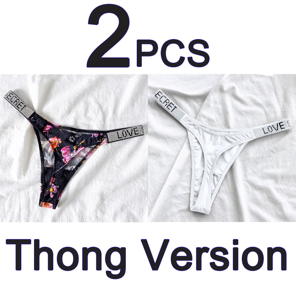 2PCS Sexy Low Waist Panties G String Comfort Satin Underwear Women Rhinestone High Fork Thong Seamless Intimates Lingerie Cotton