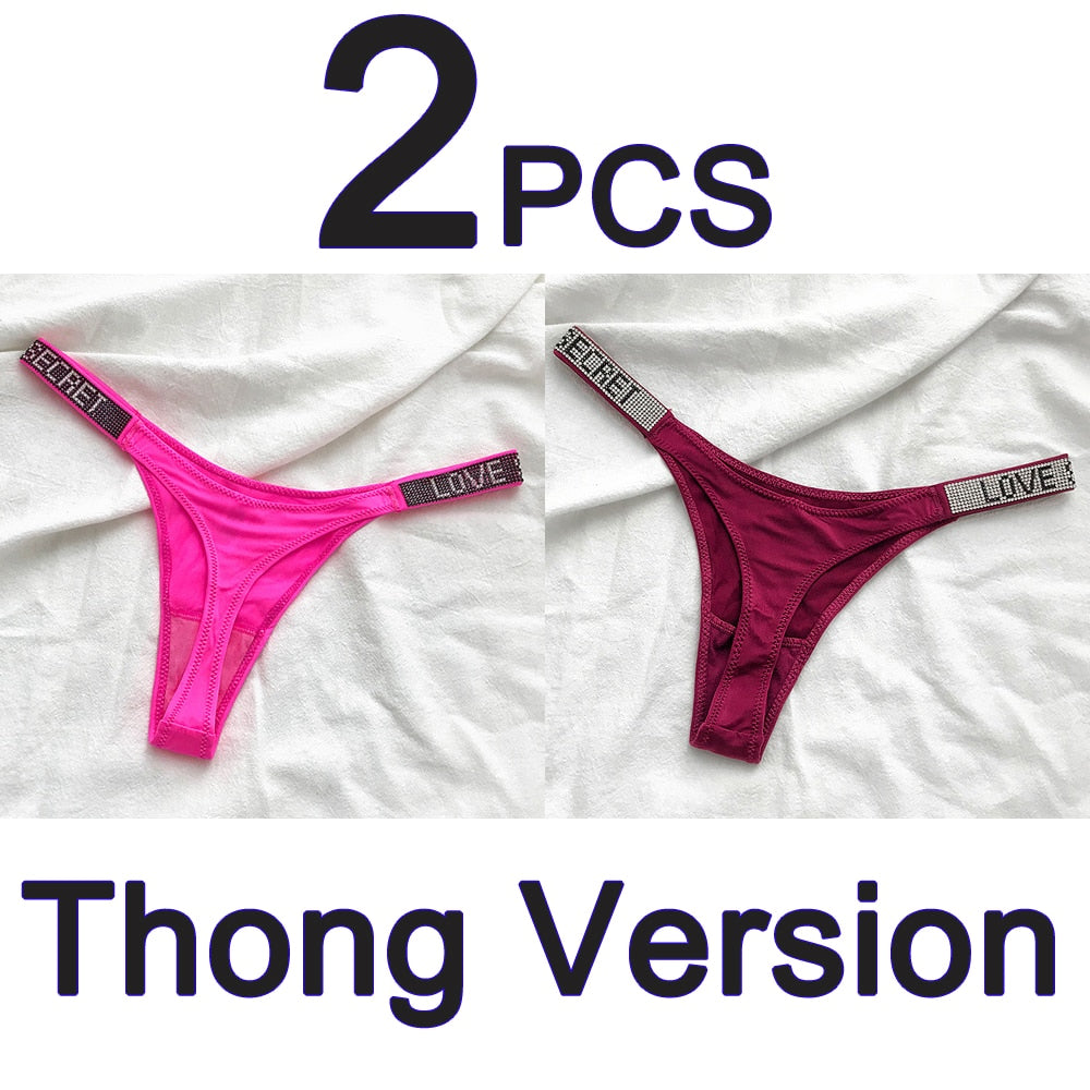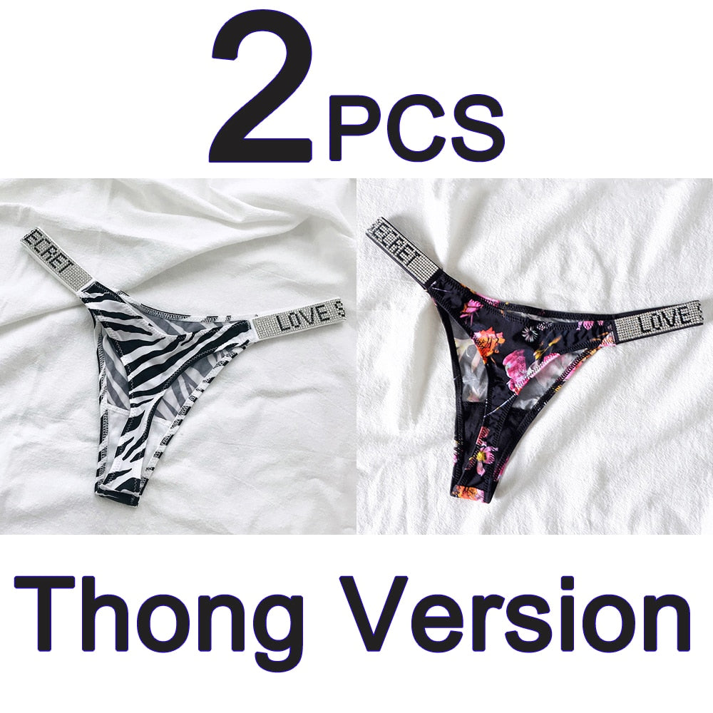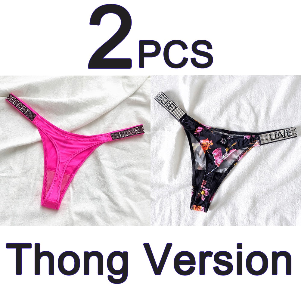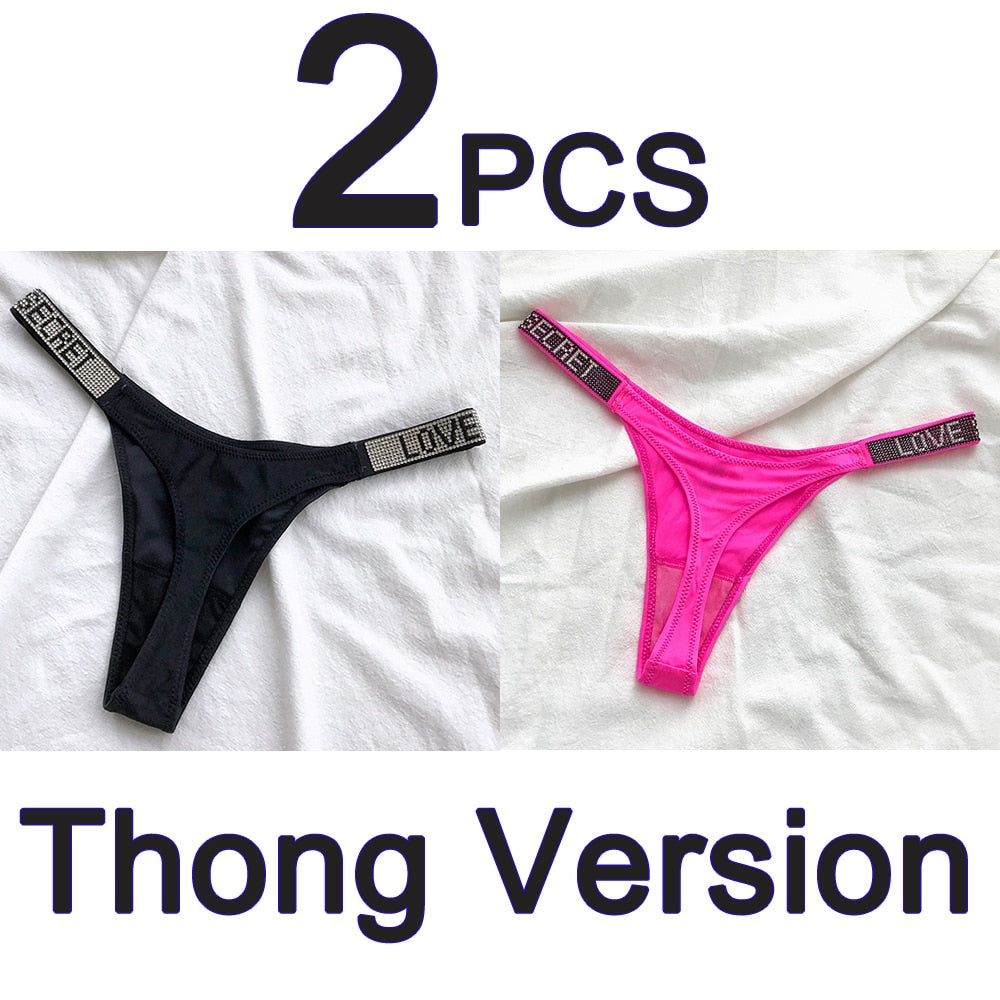 2PCS Sexy Low Waist Panties G String Comfort Satin Underwear Women Rhinestone High Fork Thong Seamless Intimates Lingerie Cotton