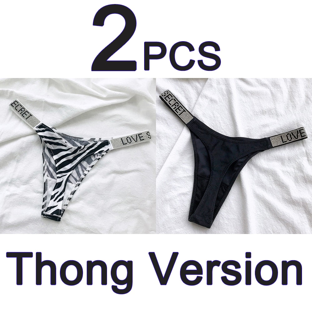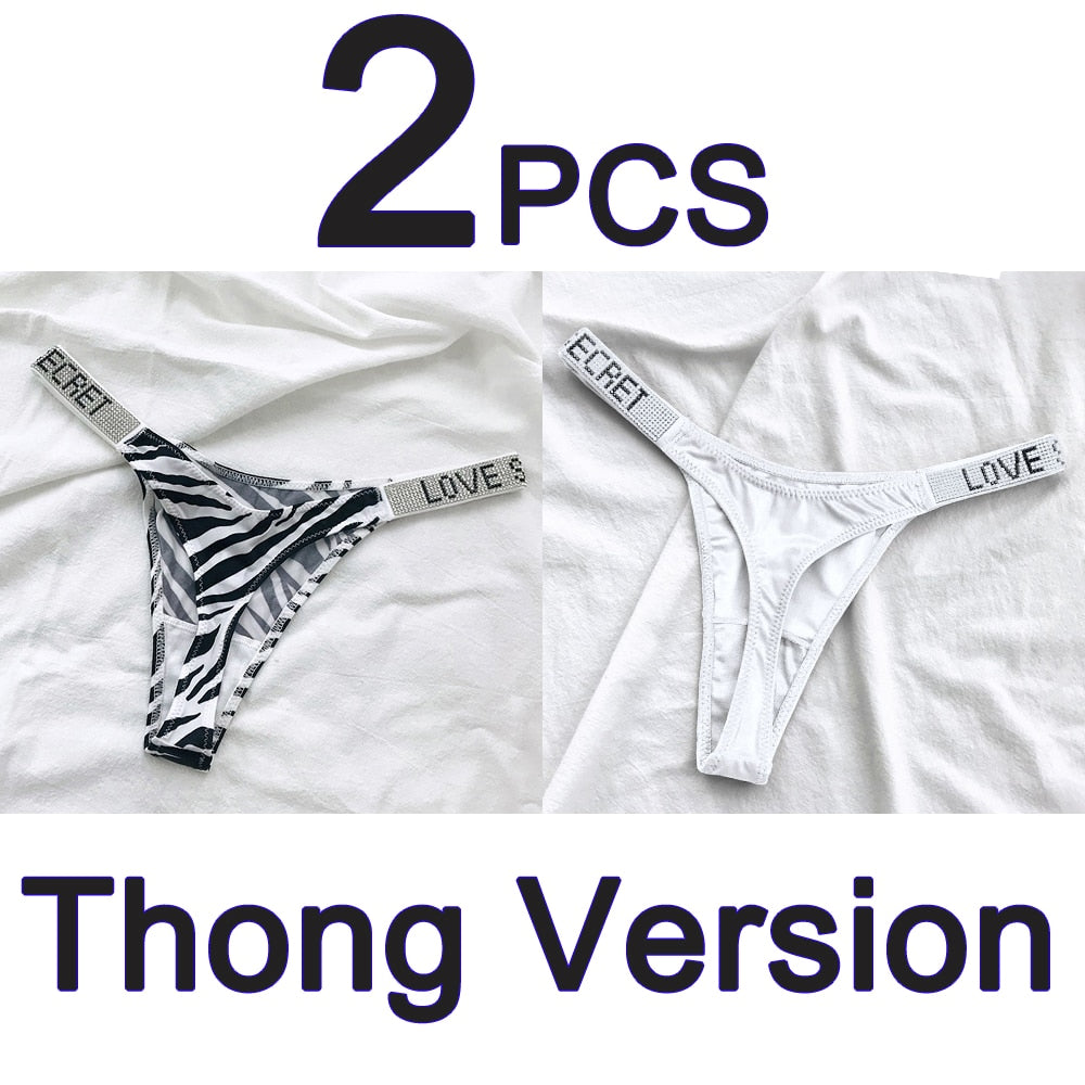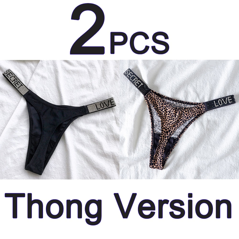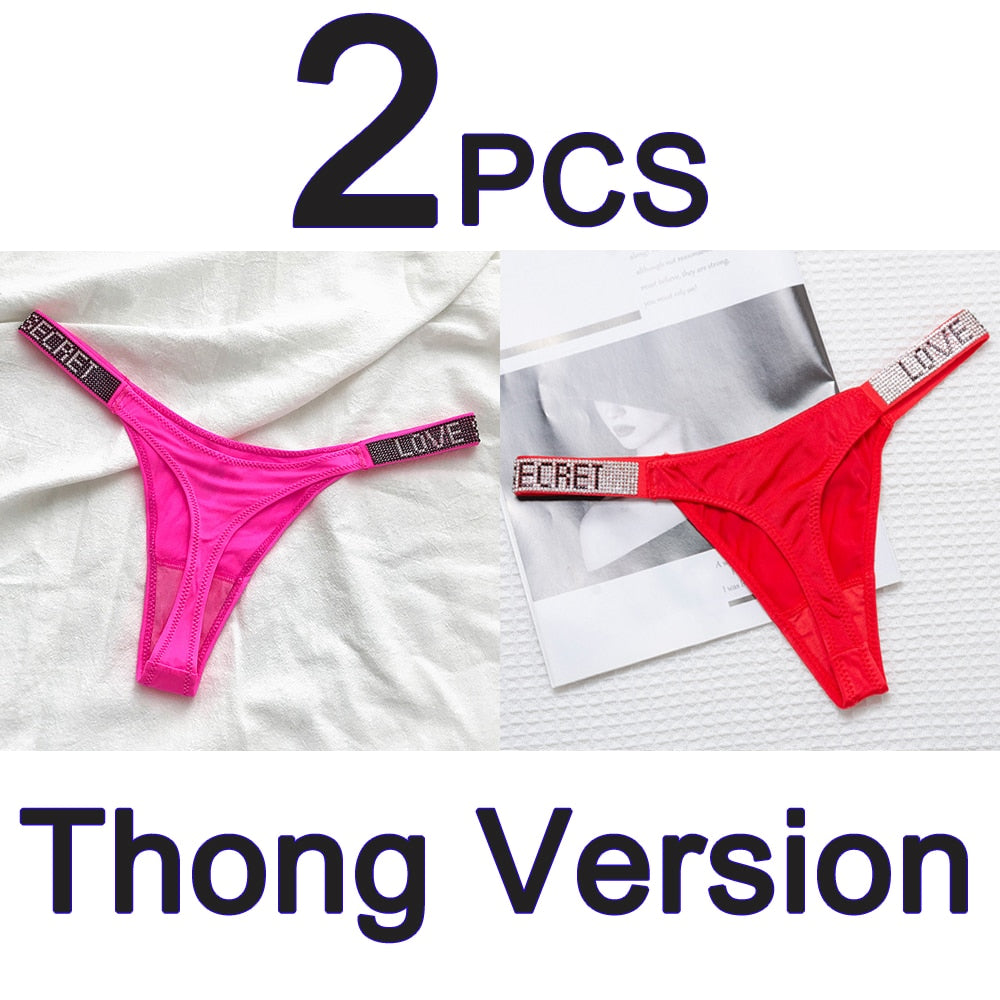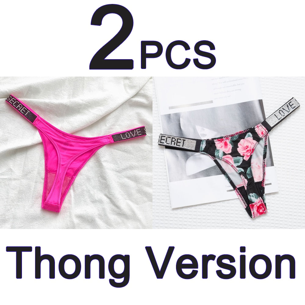 2PCS Sexy Low Waist Panties G String Comfort Satin Underwear Women Rhinestone High Fork Thong Seamless Intimates Lingerie Cotton