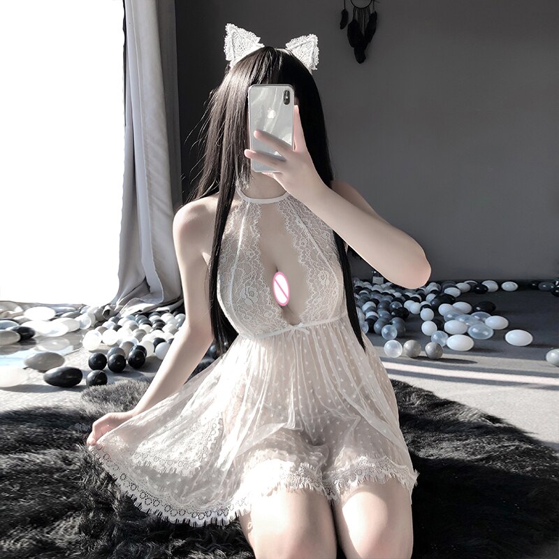 Billionm 2 Colors Sexy Transparent Mesh Lace Wave Point Women's Underwear Halter Backless Split Erotic Lingerie for Sex Plus Size