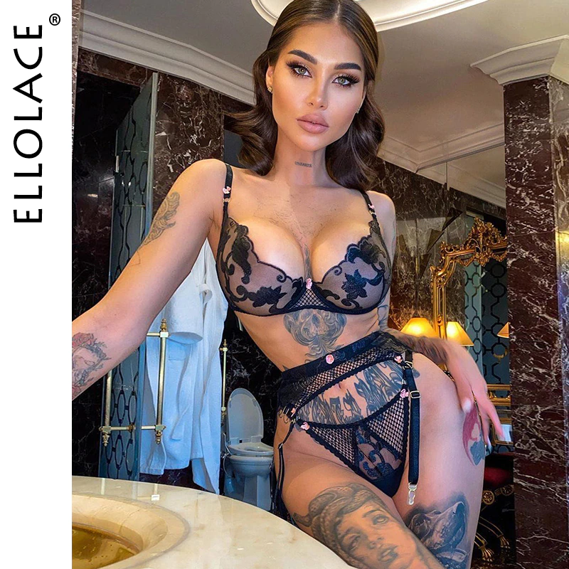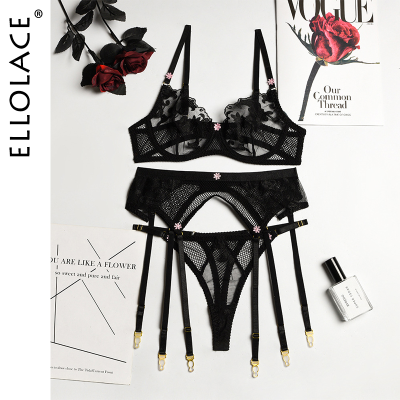 Billionm Ellolace Lingerie Women's Underwear Set Woman 3-Pieces Floral Embroidery Fancy Female Luxury Transparent Bra Sexy Outfits