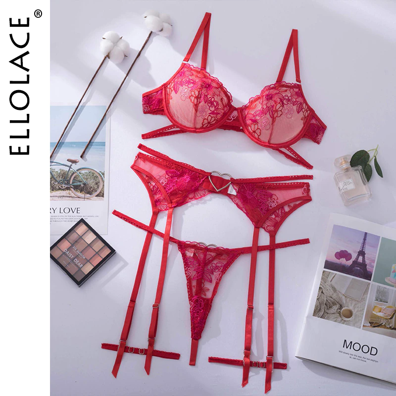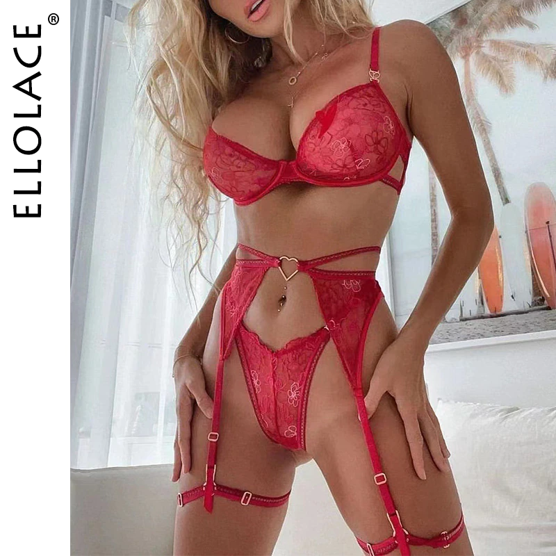 Billionm Ellolace Love Red Lingerie Sexy Bra And Panty Set 3-Pieces Luxury Lace Fancy Underwear Thongs Garters Erotic Intimate Set