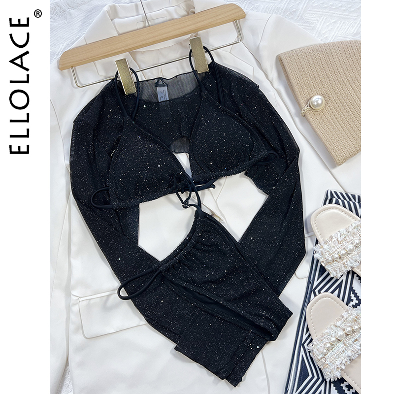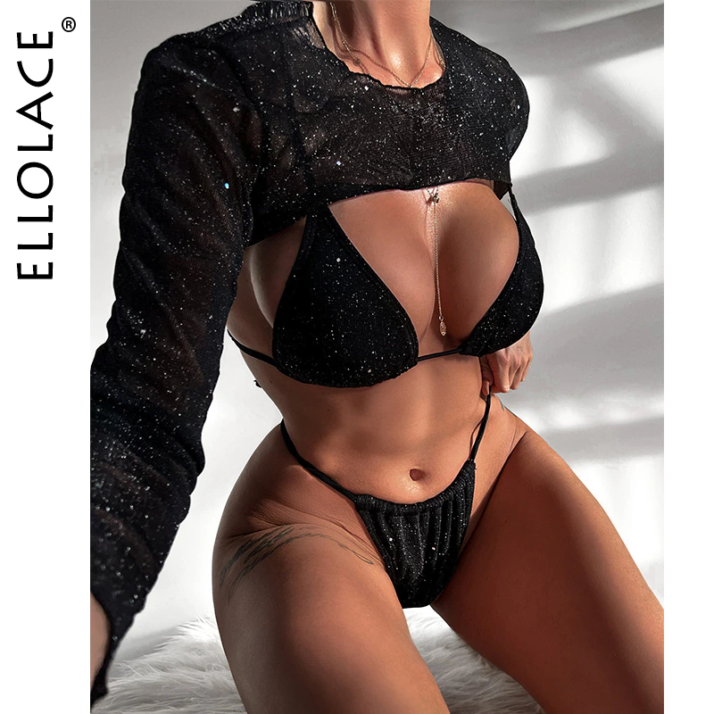 Billionm Ellolace Micro Erotic Swimsuit 2022 New Black Glitter Separate Swimwear And Crop Top Long Sleeve Harajuku Full Fantasy Bikini