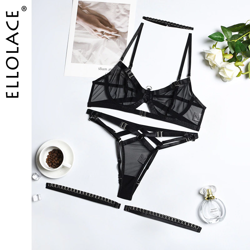 Billionm Ellolace Sensual Erotic Lingerie Patchwork Exotic Sets 4-Pieces Lace Open Crotchless Thongs Whuta Sexy Sheer Bilizna Set