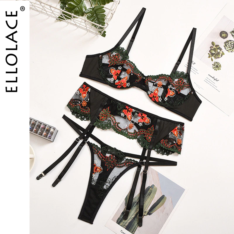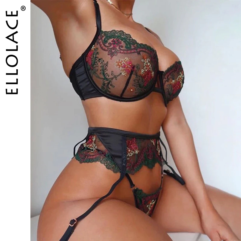 Billionm Ellolace Sexy Lingerie Set Lace Embroidery Transparent Underwear Garters Underwire Push up Floral Erotic Women 3 Piece Set