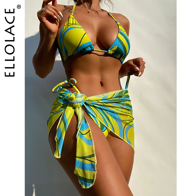 Billionm Ellolace Swimsuit And Cover Up 2022 New Halter Print Green Micro Bikini Padded Swimwear Big Breast Attraco Sexy Brazilian Outfit