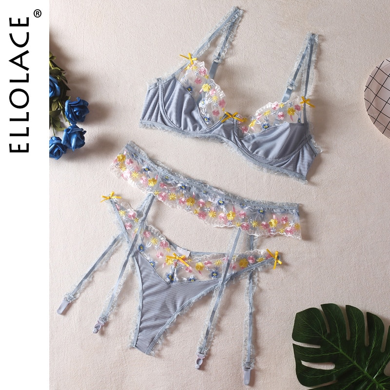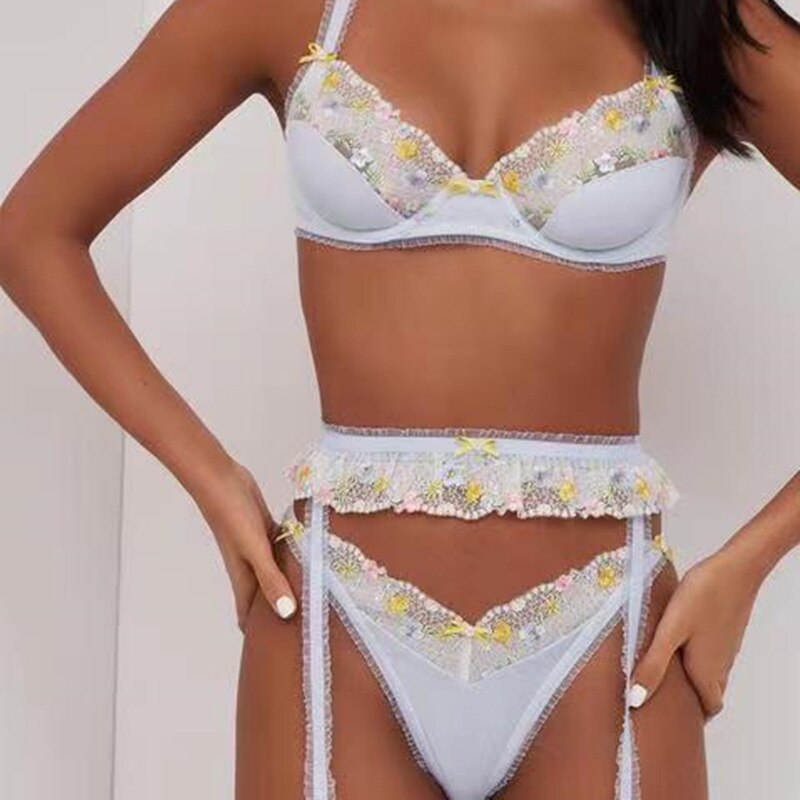 Billionm Fairy Lingerie Garter Set Lace Embroidery Bra 3-Pieces Outfit Fancy Ruffles Underwear Boats Delicate Luxury Intimate