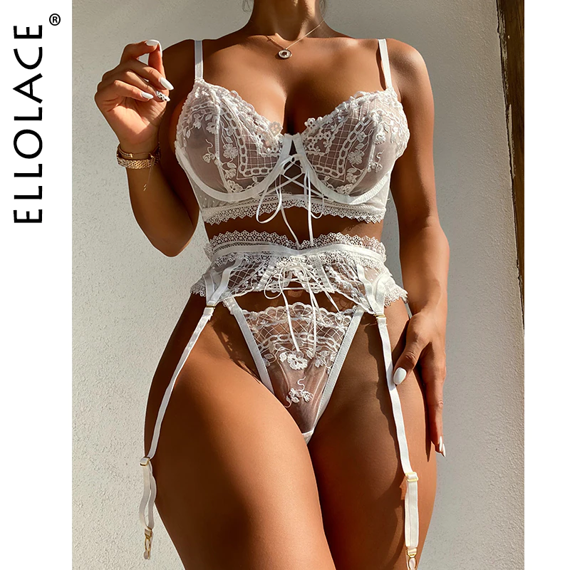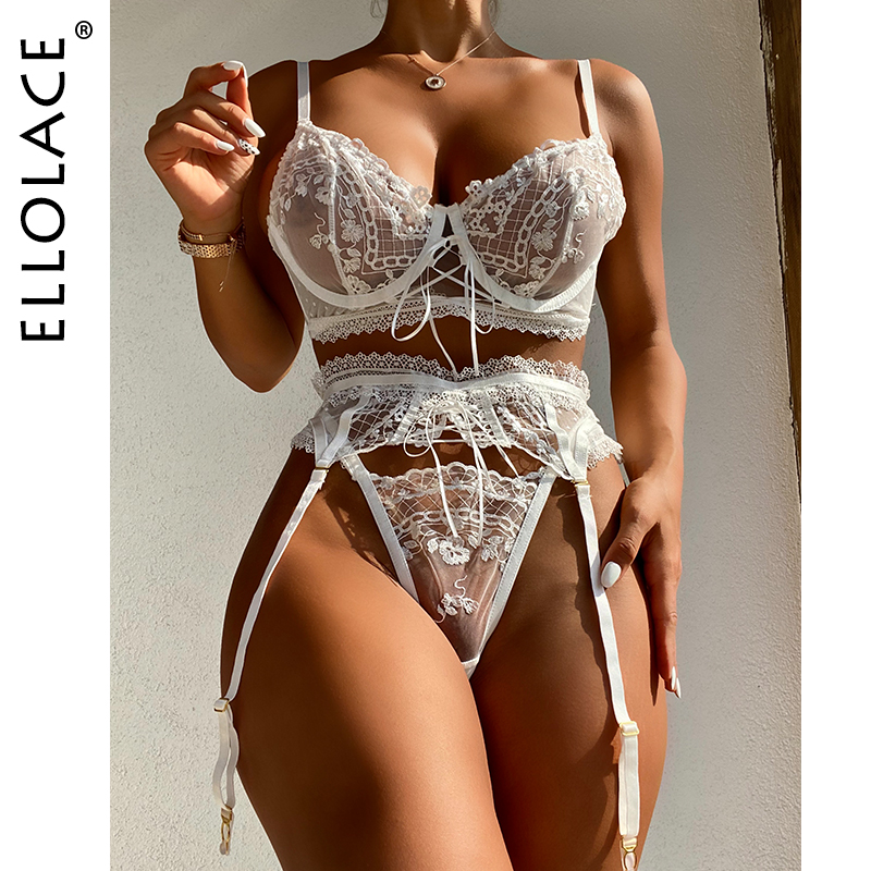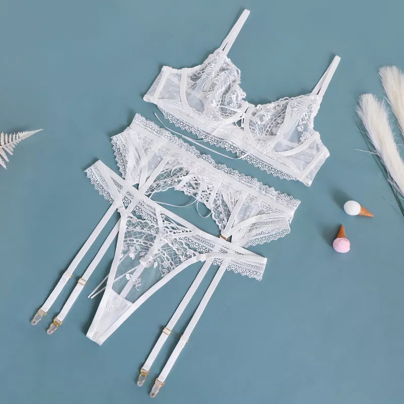 Billionm Feminine Lingerie Luxury Lace Sexy Couple Underwear Embroidery Transparent Bra And Thongs Garters 3-Piece Intimo