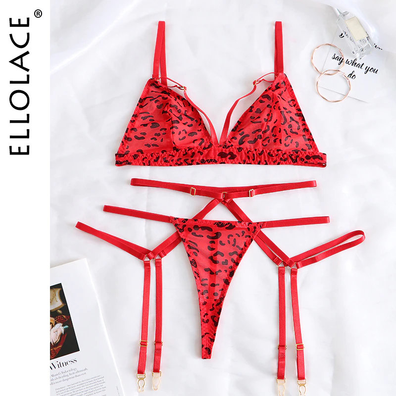 Billionm Leopard Female Lingerie Red Underwear 3-Pieces Lace Wireless Bra Thongs With Garters Belt Erotic Intimate Fancy Outfits