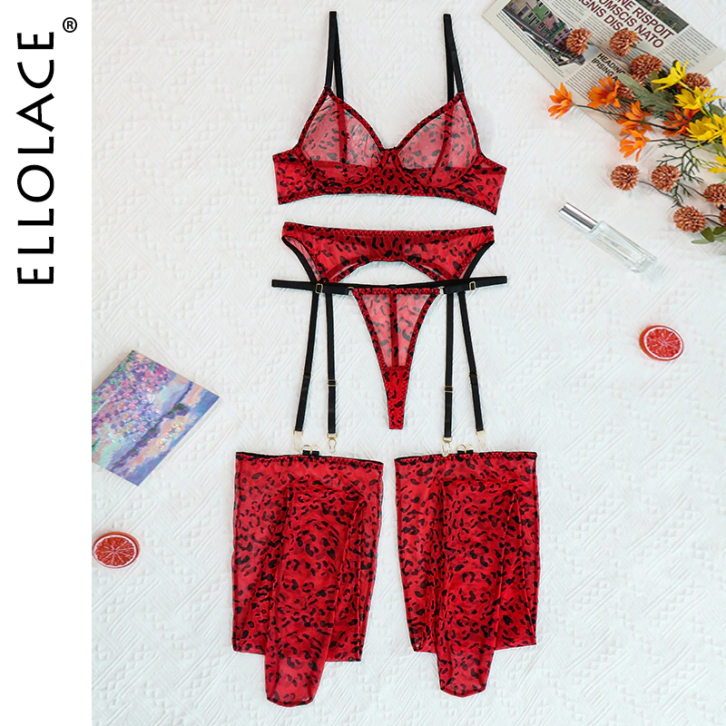 Billionm Leopard Lingerie For Women Lace Set Of Underwear With Stockings 4-Pieces Erotic Thongs Garter Fancy Matching Outfit