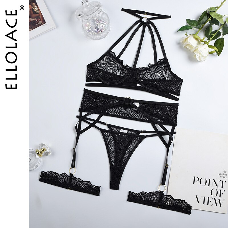 Billionm Lingerie Halter Female Underwear Erotic 3-Pieces Transparent Half Cup Bra Briefs With Garters Black Lace For Linen