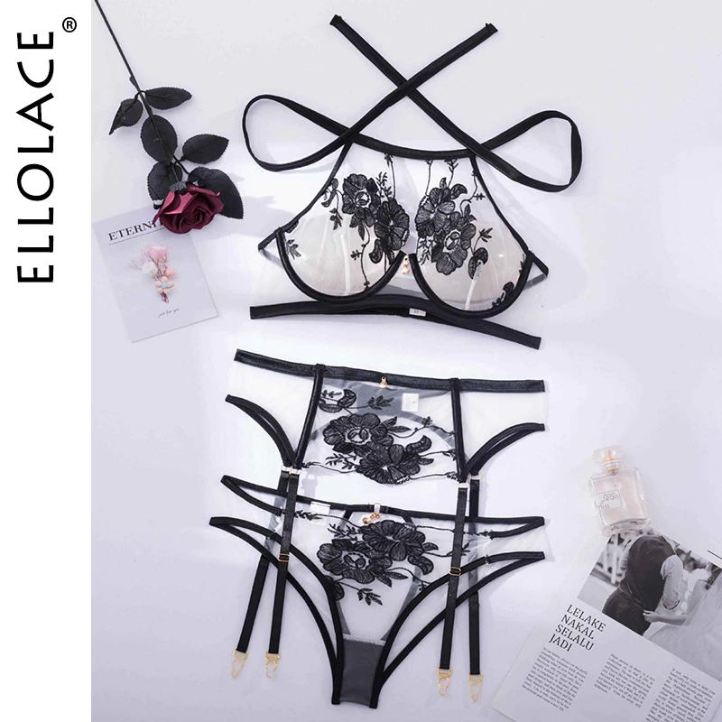 Billionm Lingeries Lace Underwear 3-Pieces Sensual Erotic Sets Embroidery Transparent Halter Bra Cut Out Panties Intimate Set