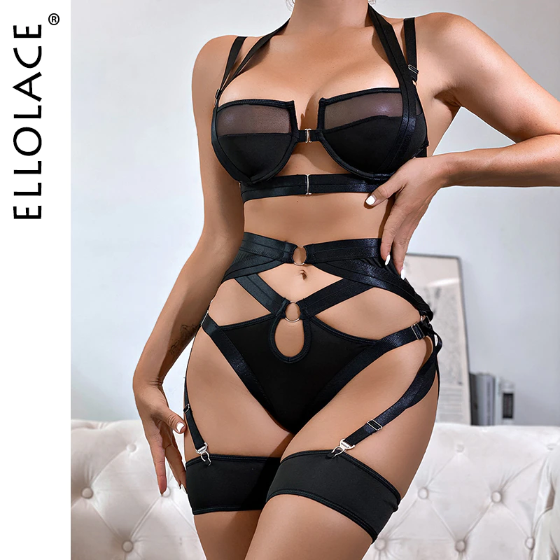 Billionm Luxury Lingeries Fancy Underwear Erotic Crotchless Briefs Garter Belt With Stockings 3-PIeces Push Up Bra And Panty Set