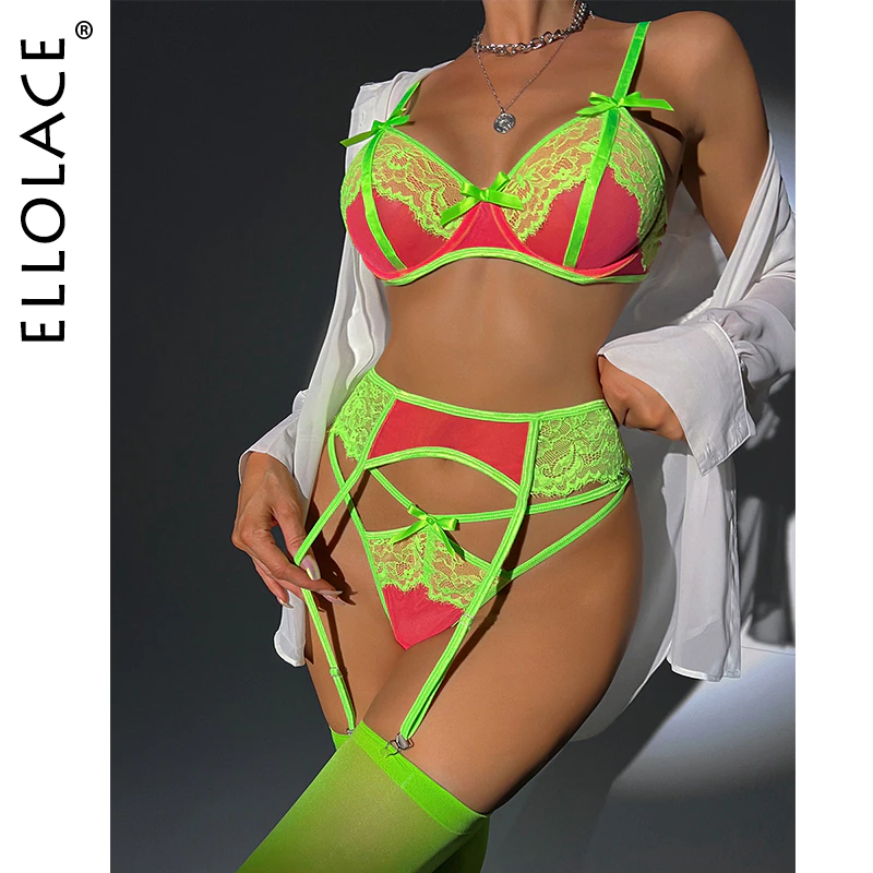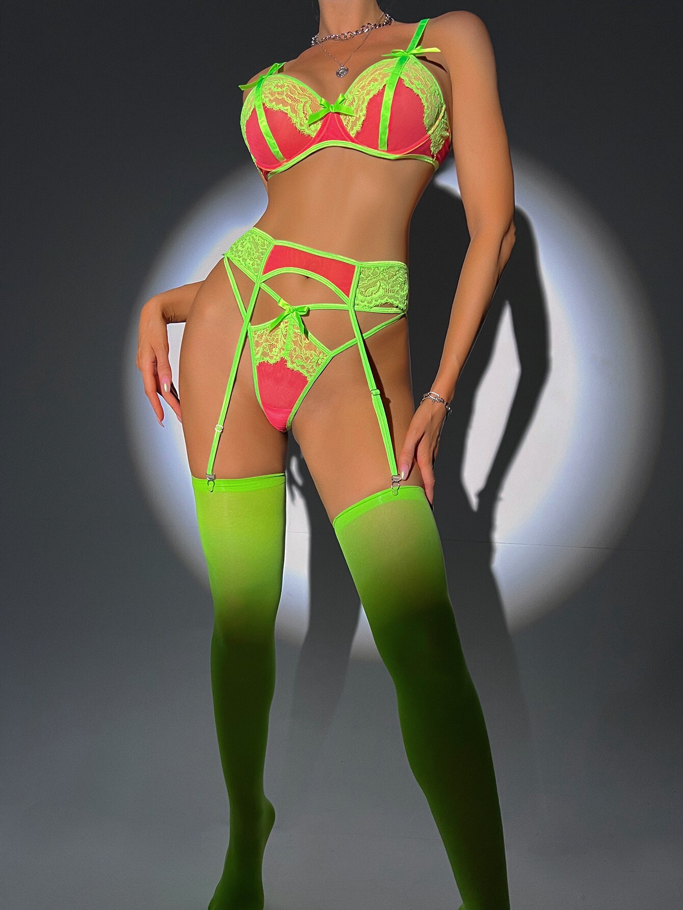 Billionm Neon Lingerie 4-Pieces Patchwork Lace Seamless Bra Crotchless Thongs Erotic Garter Belt Set Sexy Couple Underwear