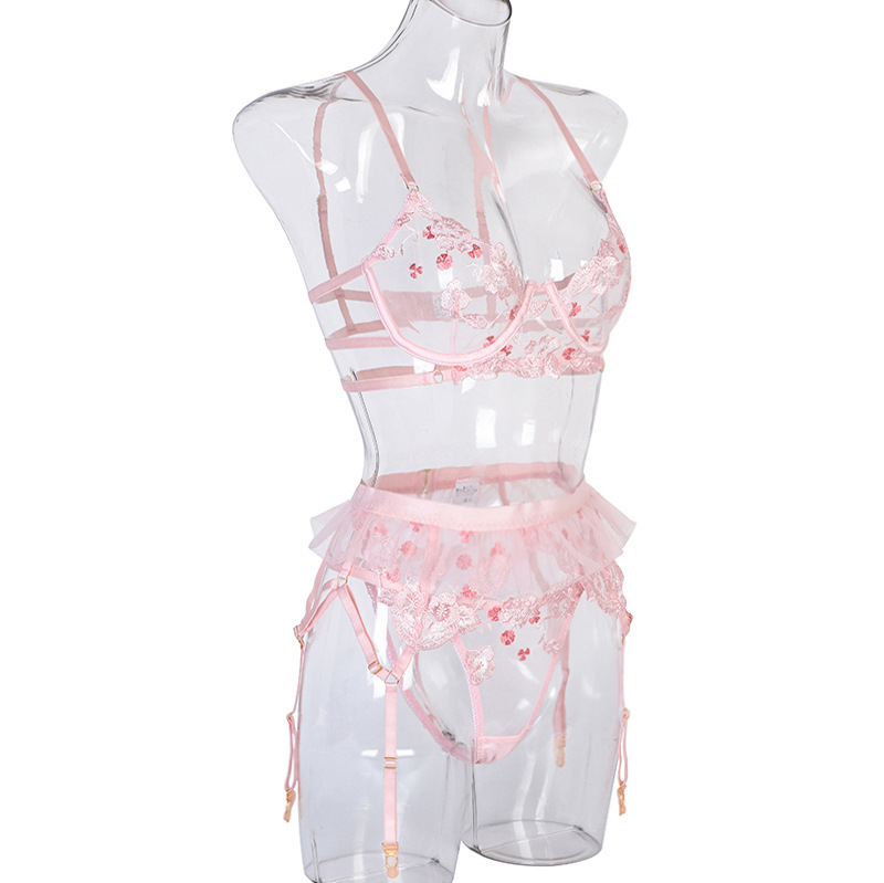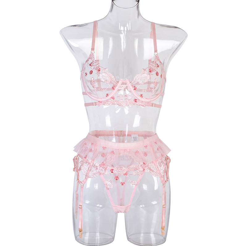 Billionm New Women Lingerie Pink Bra and Panty Sensual Lace Sheer Underwear Langerie Floral Embroidery Transparent 3pcs Patchwork Costume