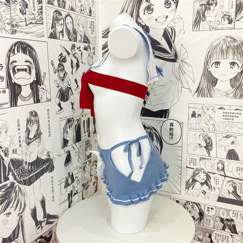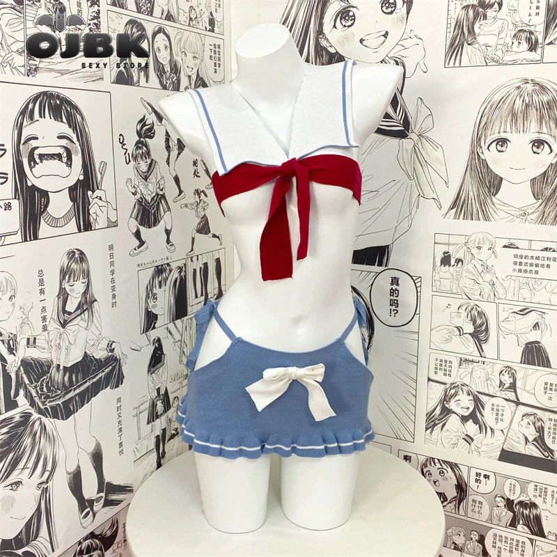 Billionm OJBK Japanese Hollow Out Sweater Student JK Uniform Sexy Lingerie Pajamas Cosplay Girls Lovely Bowknot Bra And Panty Set 2021NEW