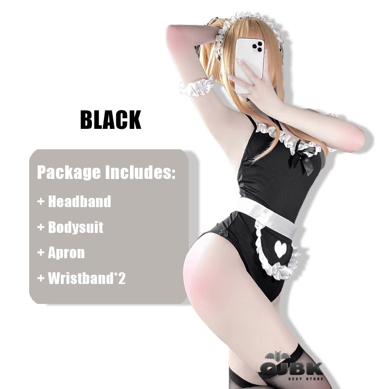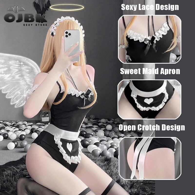 Billionm OJBK Women Sexy Lingerie Maid Cosplay Outfit Hidden Button With Sexy Lace Apron One-Piece Bodysuit