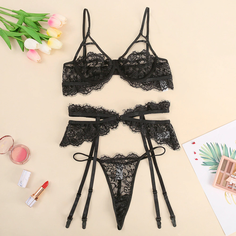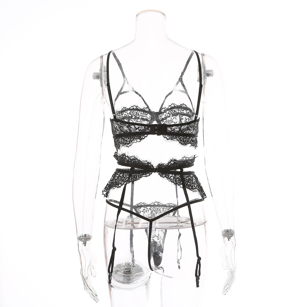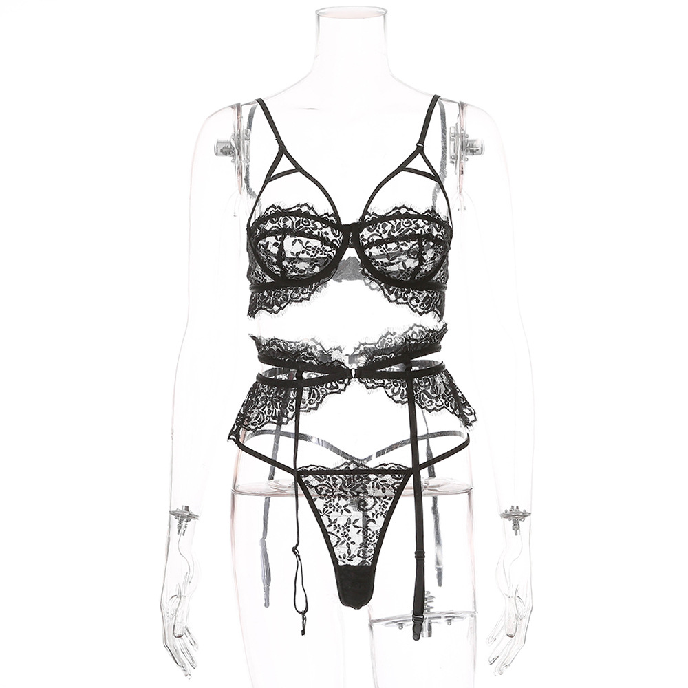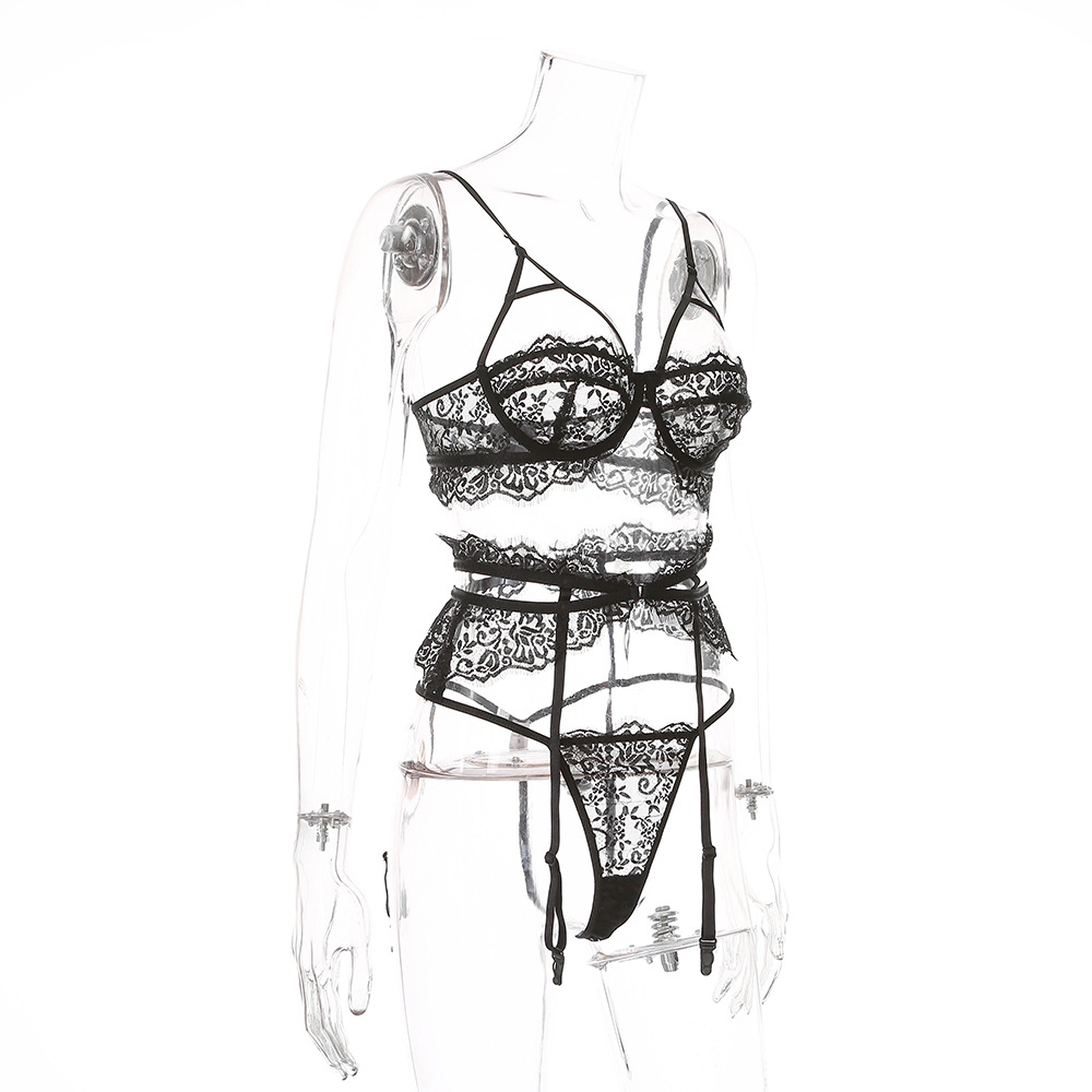 Billionm SexeLakas Sexy Underwear Set Women Lace Hollow Lingerie 3 Pieces Porno Intimates Set Gathered Bra Transparent Brief T Back Thong