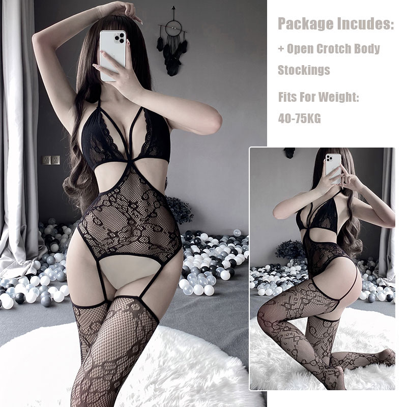 Billionm Sexy Crotchless Outfit Body Stocking Women Black Foloral Mesh Bodysuit Teddy Tights Fishnet Bodytocking Exotic Lingerie Jumpsuit