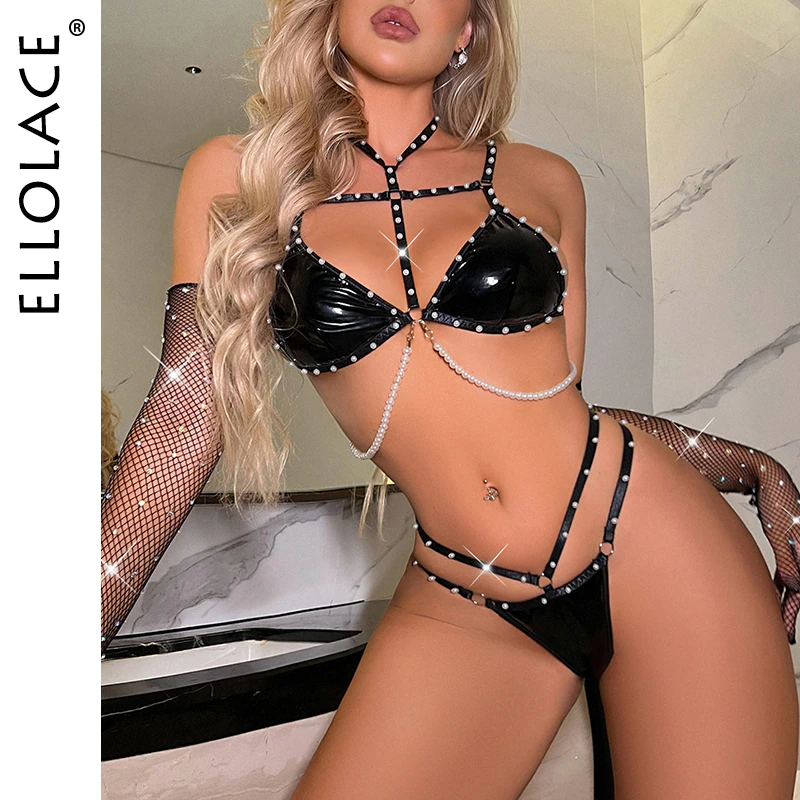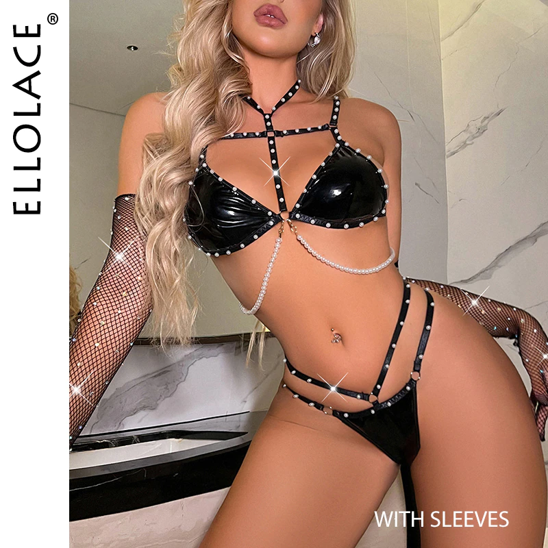Billionm Sexy Latex Lingerie With Pearl Set Woman 3 Pieces Erotic Thongs Black Leather Intimate Set Luxury Exotic Underwear