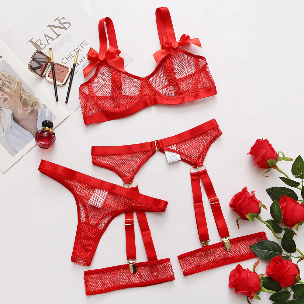Billionm Sexy Neon Lingerie With Stockings Lace Bowknot Transparent Underwear Cute Mesh 3-Pieces Hot Seethrough Exotic Sets