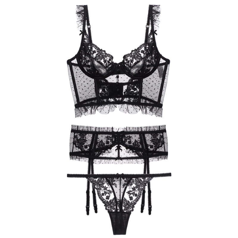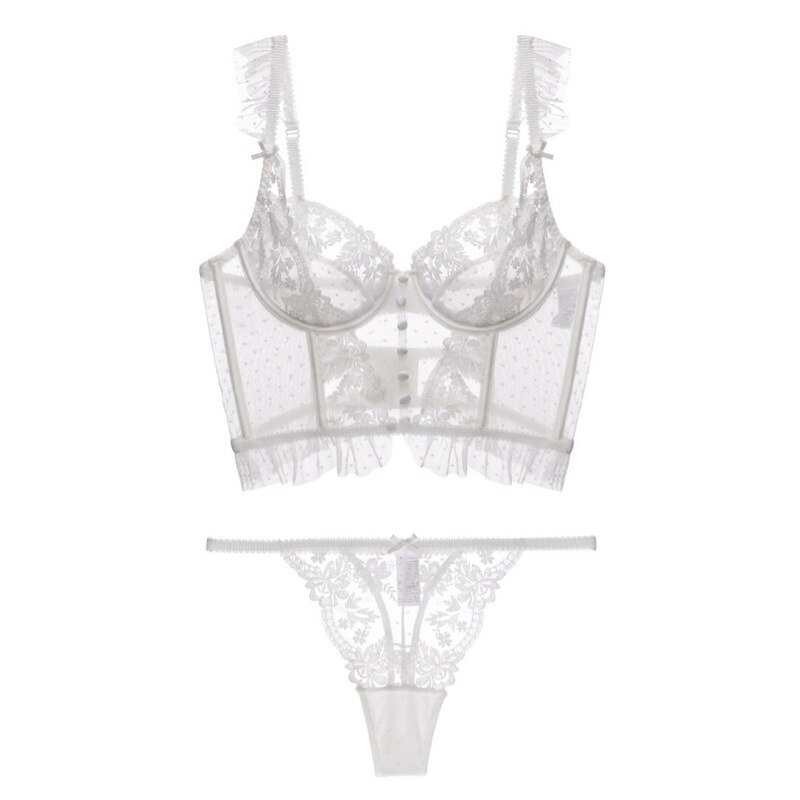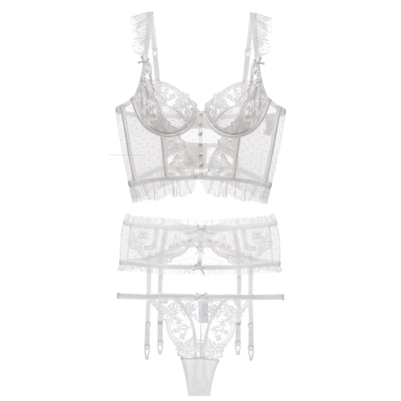 Billionm Underwear Backless French Ultra-thin Lace Embroidery Dot Bra Set Buttons Decorate Women Intimate 3 Pieces Bra+Thongs+Garter