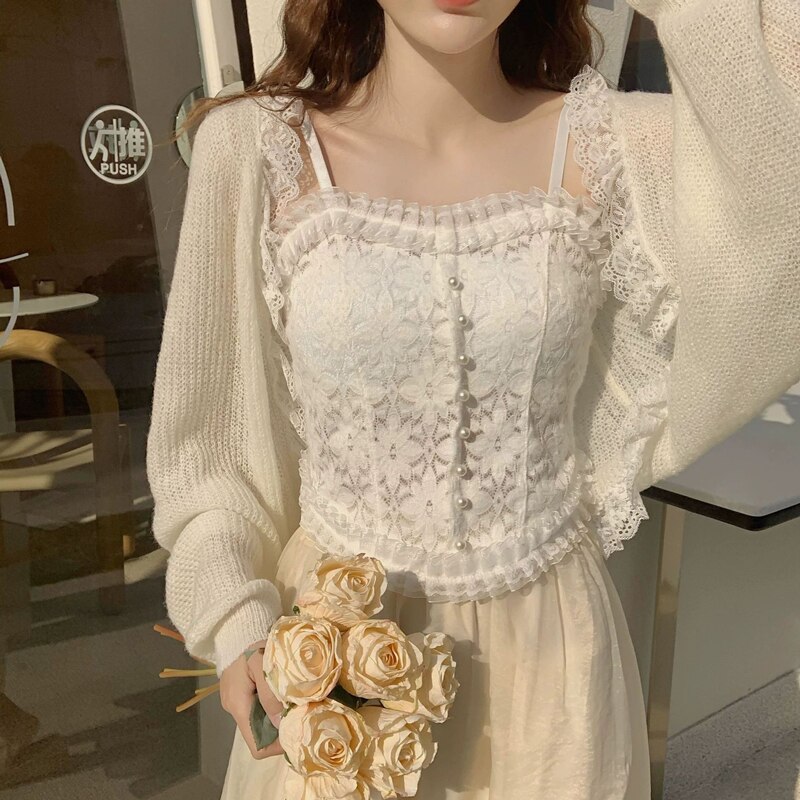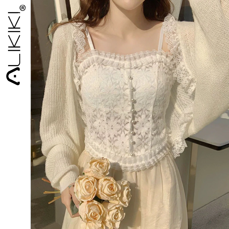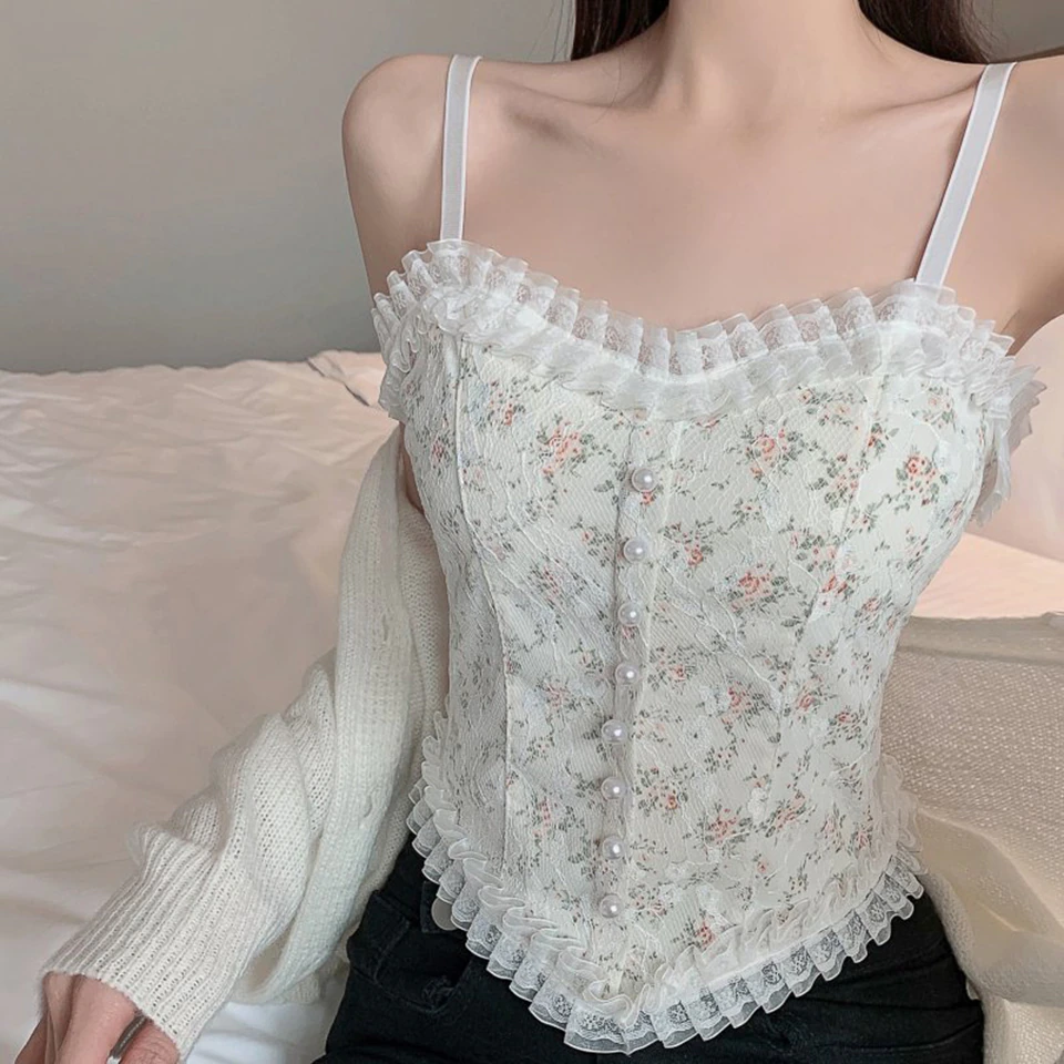 Billionm Women Pearl Sexy Vintage Corset Lace Crop Tops Bralette Cute Camis Vest Spaghetti Straps Elegant French Tank Top Party Clubwear