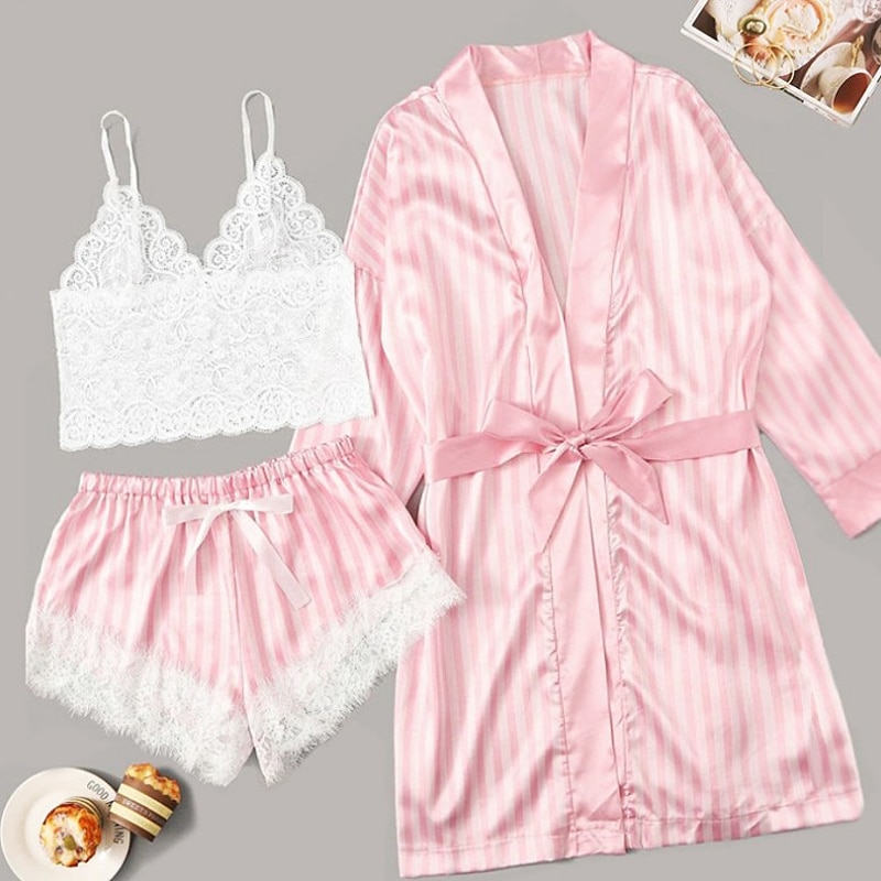 Billionm Women Pink Striped Pajamas Sets Satin Sleepwear Pijama Silk Home Wear Sexy Nightie Lace Sleep Lounge Pyjamas Long Nightgown