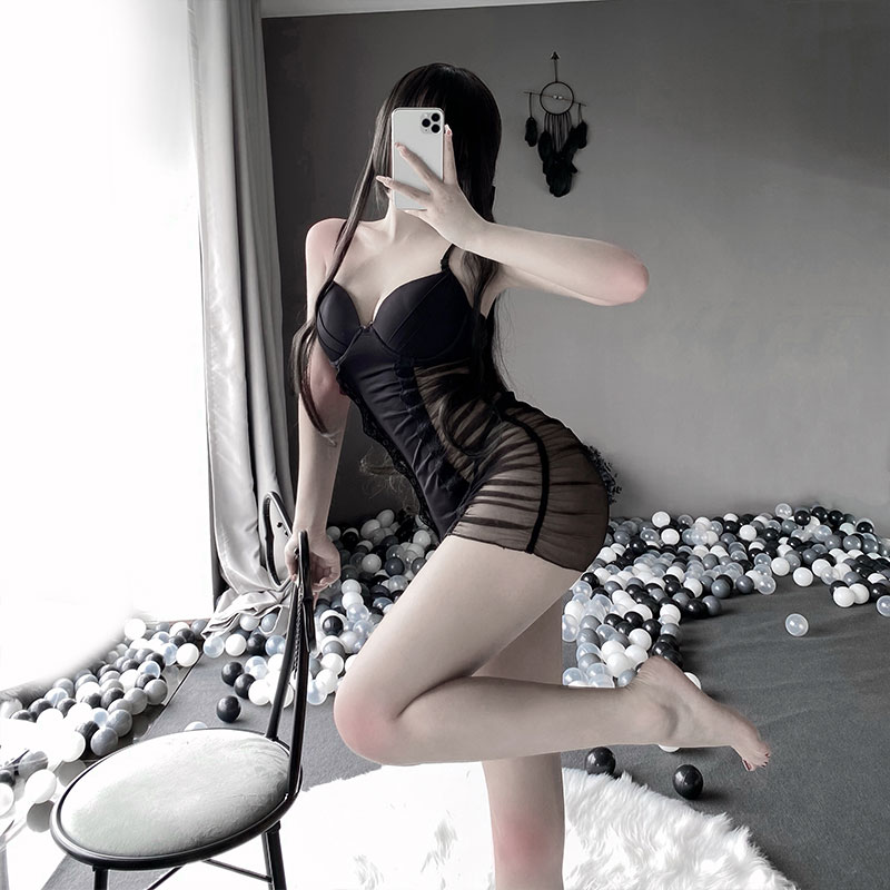 Billionm Women's Lingerie Lace Strap Chemise Mesh Sleepwear Black Transparent Pajamas Sexy Body Curves Outfits For Female Night Dress