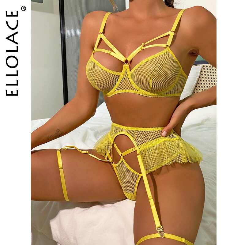 Billionm Yellow Lingerie Female Underwear Mesh Lace Erotic 3-Pieces Ruffles Garters Transparent Bra Intimo Fancy Outfits