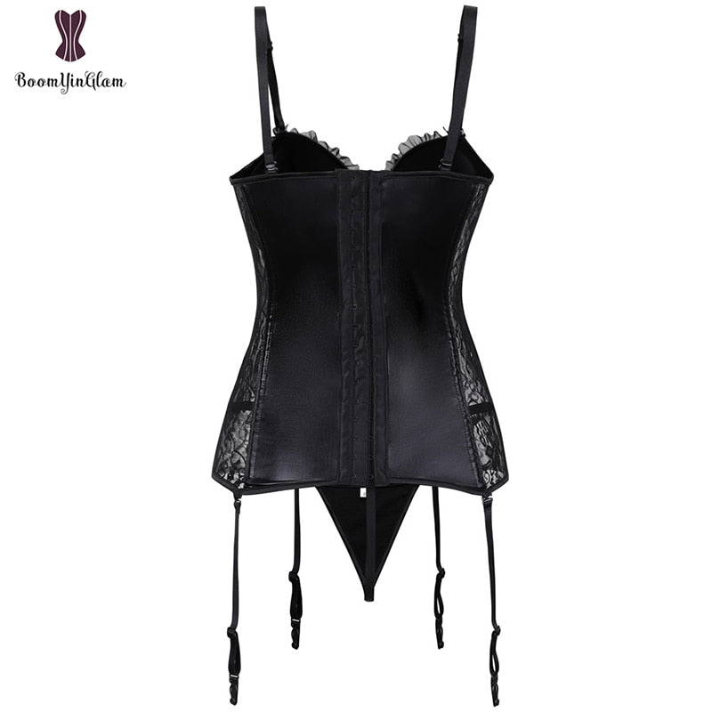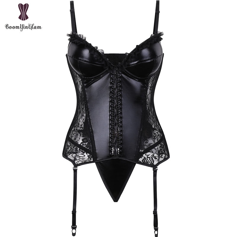 Black Shinny Women's Steampunk Gothic Lace Corset Faux Leather Bra Bustier Lingerie Plus Size S-XXXXXXL