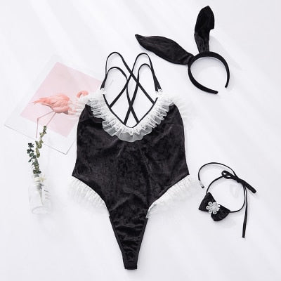 Cute Anime Bunny Girl Cosplay Costume Halloween Women Rose Pink Velvet Sexy Jumpsuit Erotic Roleplay Kawaii Lingerie for Couple