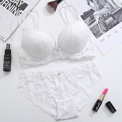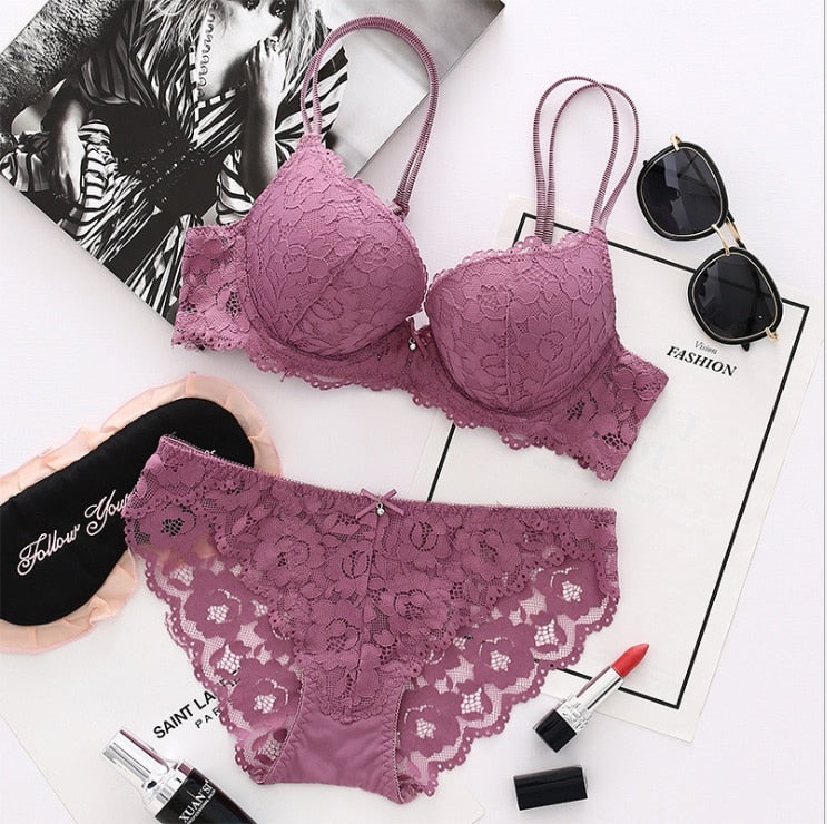 DERUILADY Lace Floral Lingerie Set Push Up Bra Women Comfort Adjusted Bra And Panty Set Sexy Backless Wireless Underwear Set