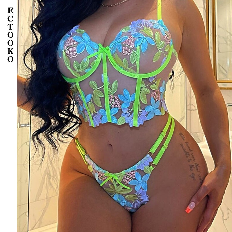 ECTOOKO Sensual Lingerie Set Sexy Floral Embroidered Women's 2 Piece Set Underwire Bra Thongs Hot Exotic Intimate Neon Underwear