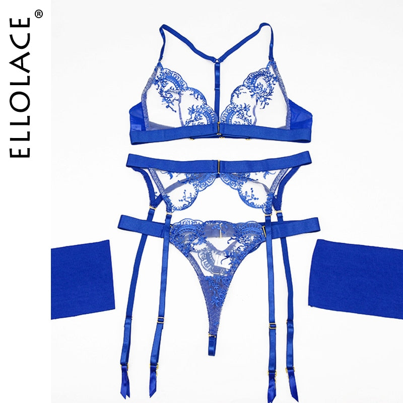 Ellolace Breves Lingerie Brief Sets with Garters Transparent Erotic Underwear Wireless Bra and Thongs Blue Lace Bilizna Set