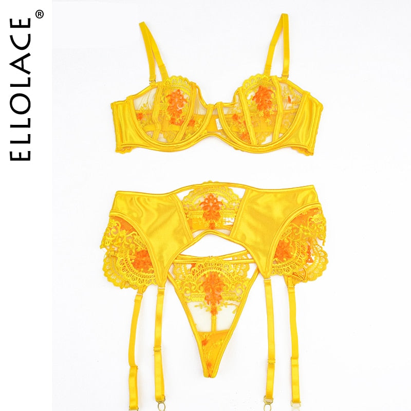 Ellolace Erotic Fancy Lingerie Lace Embroidery Underwear Set Transparent Bra Kit Push Up Brief Garters Sexy Intimate Exotic Sets