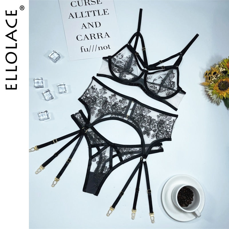 Ellolace Erotic Lingerie Set Woman 3 Pieces Sensual Embroidery Transparent Brief Sets Fancy Garters Luxury Lace Sexy Outfits