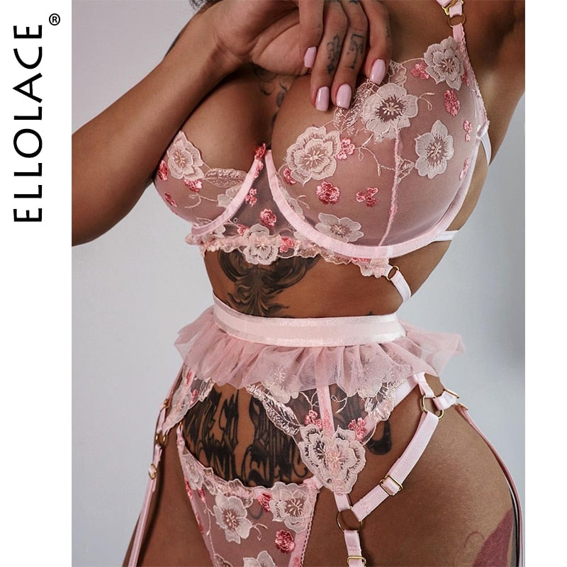 Ellolace Erotic Lingerie Sexy Lace Sensual Underwear Set Floral Transparent Brief Sets 3 Piece Push Up Underwire Bra and Panty