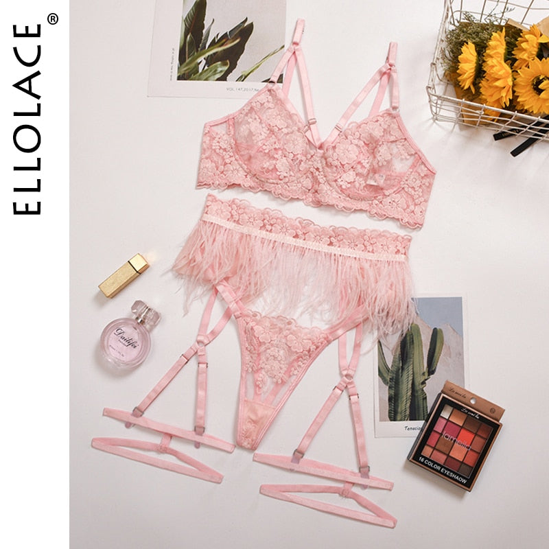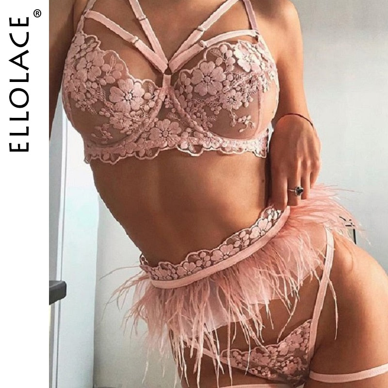 Ellolace Feather Lingerie Set Sexy Underwear Set Transparent Lingerie Women 3 Pcs Set Female Underwear Bra And Panty Set