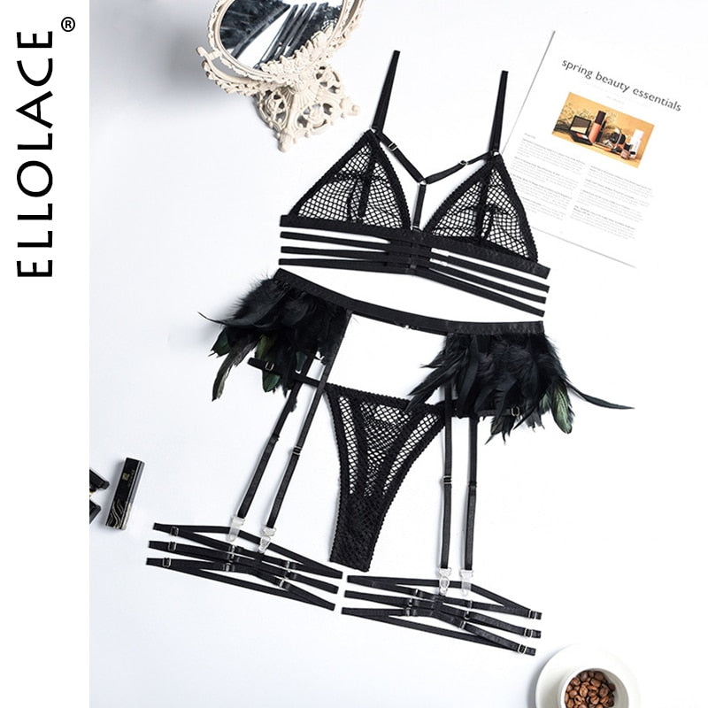 Ellolace Feather Sheer Lingerie Transparent Sensual Four-Piece Set Sexy Mesh Fancy Short Skin Care Kits Lace Kiss Underwear