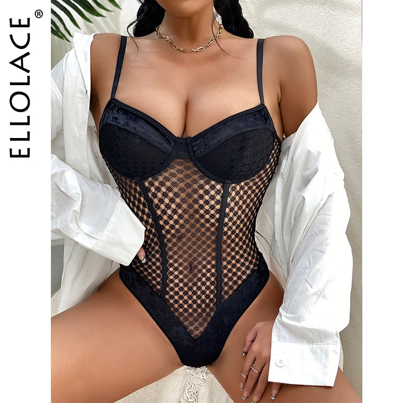 Ellolace Fishnet Bodysuit Sexy Velvet Bodycon Black Lingerie Top See Through Tempt Teddy Sleeveless Bodysuit With Crotch