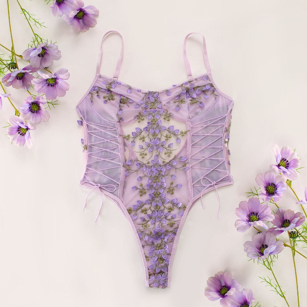 Ellolace Floral Embroidery Bodysuit Women Lace Up Bandage Bodies Sexy Sleeveless Bodycon Transparent Lingerie Mesh Bodysuits Top